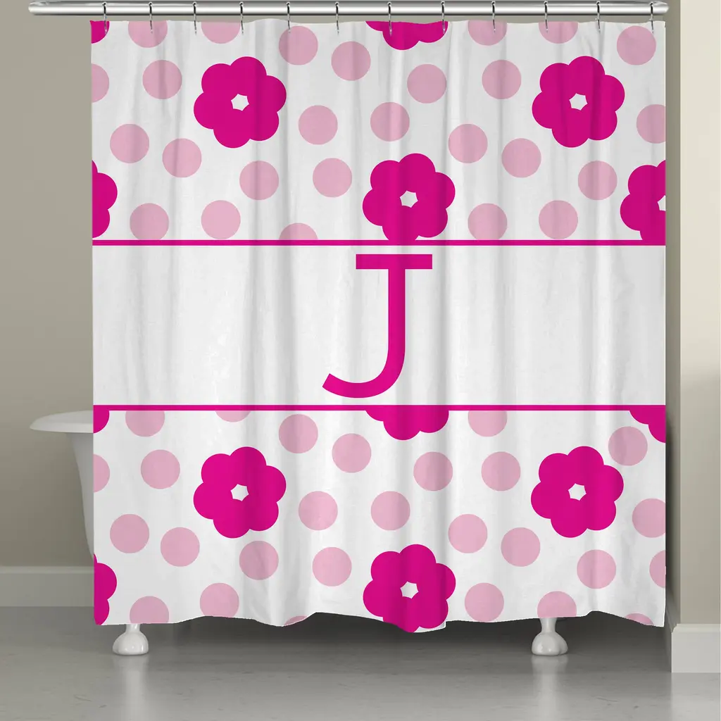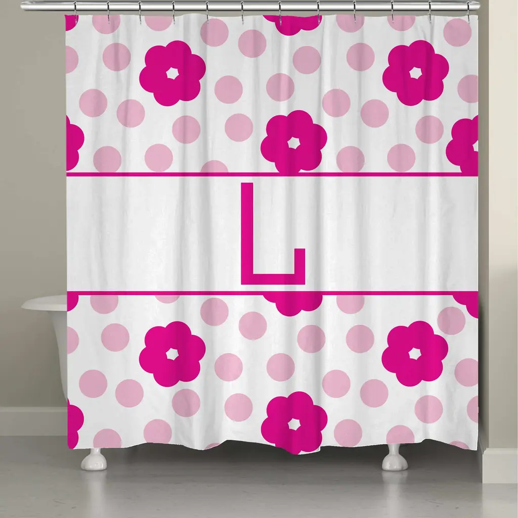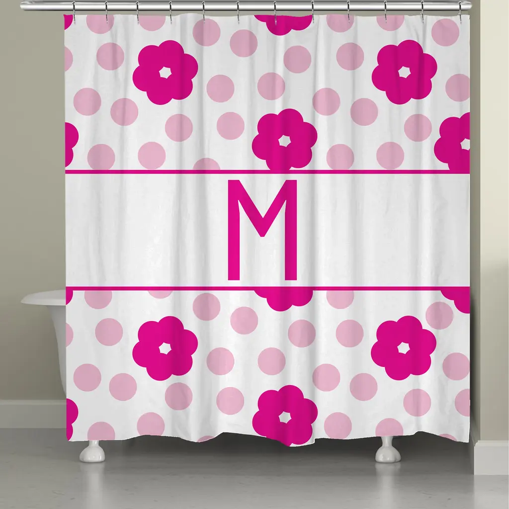 Give your bathroom a personalized touch with this fun, flower and polka dotted shower curtain. This shower curtain is digitally printed to create crisp, vibrant colors and images. It is made to order with 12 button holes at the top for shower hook placement. Material: Polyester Pattern: Floral, kids, novelty Color: White, pinkDimensions: 71 inches high x 74 inches wide