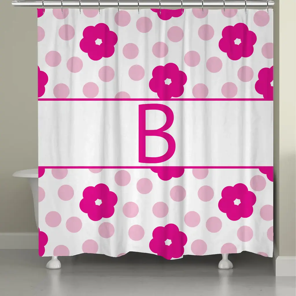 Give your bathroom a personalized touch with this fun, flower and polka dotted shower curtain. This shower curtain is digitally printed to create crisp, vibrant colors and images. It is made to order with 12 button holes at the top for shower hook placement. Material: Polyester Pattern: Floral, kids, novelty Color: White, pinkDimensions: 71 inches high x 74 inches wide
