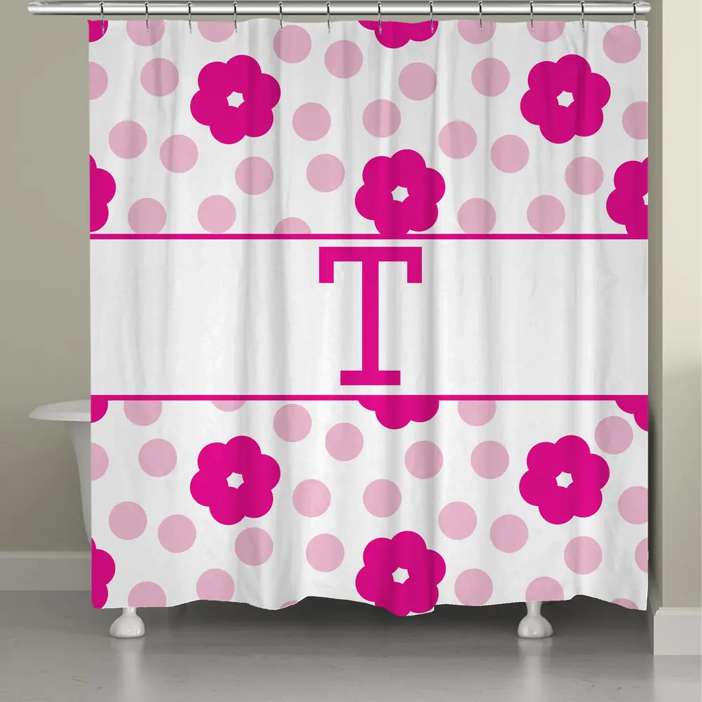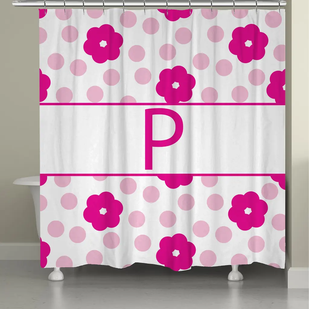 Give your bathroom a personalized touch with this fun, flower and polka dotted shower curtain. This shower curtain is digitally printed to create crisp, vibrant colors and images. It is made to order with 12 button holes at the top for shower hook placement. Material: Polyester Pattern: Floral, kids, novelty Color: White, pinkDimensions: 71 inches high x 74 inches wide