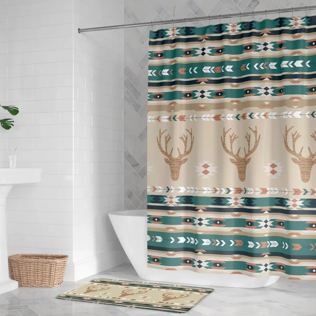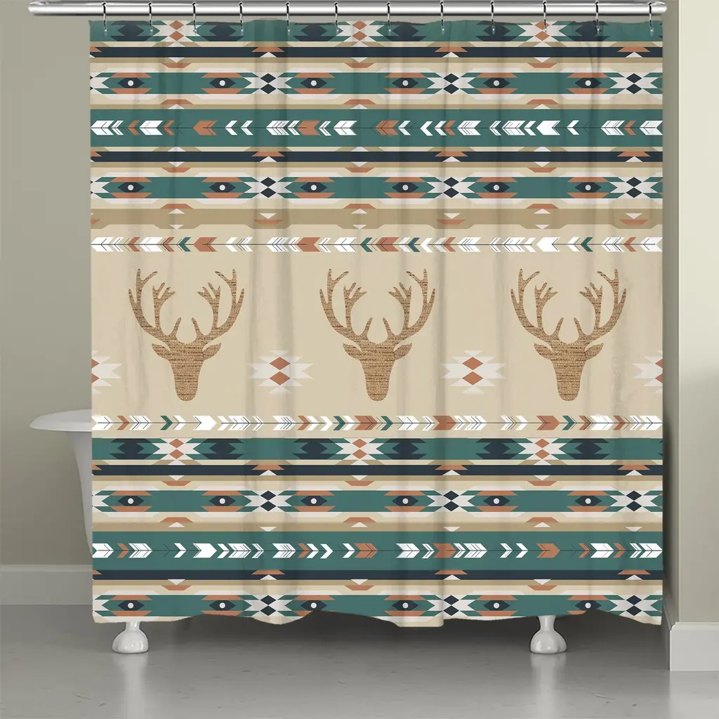 The "Mesa Teal Green Deer" shower curtain from Laural Home features a row of buck heads in the center with intricate patterns adorned on the top and bottom. Designed in tonal greens, blues, browns and white, this shower curtain is the perfect addition to any lodge, lake or southwestern themed home.Artwork by Ta-Da Innovations, Inc., Presented by Laural HomeAll of our products are digitally printed to create crisp, vibrant colors and images. Made to order in the USA on imported fabric, with you in mind.