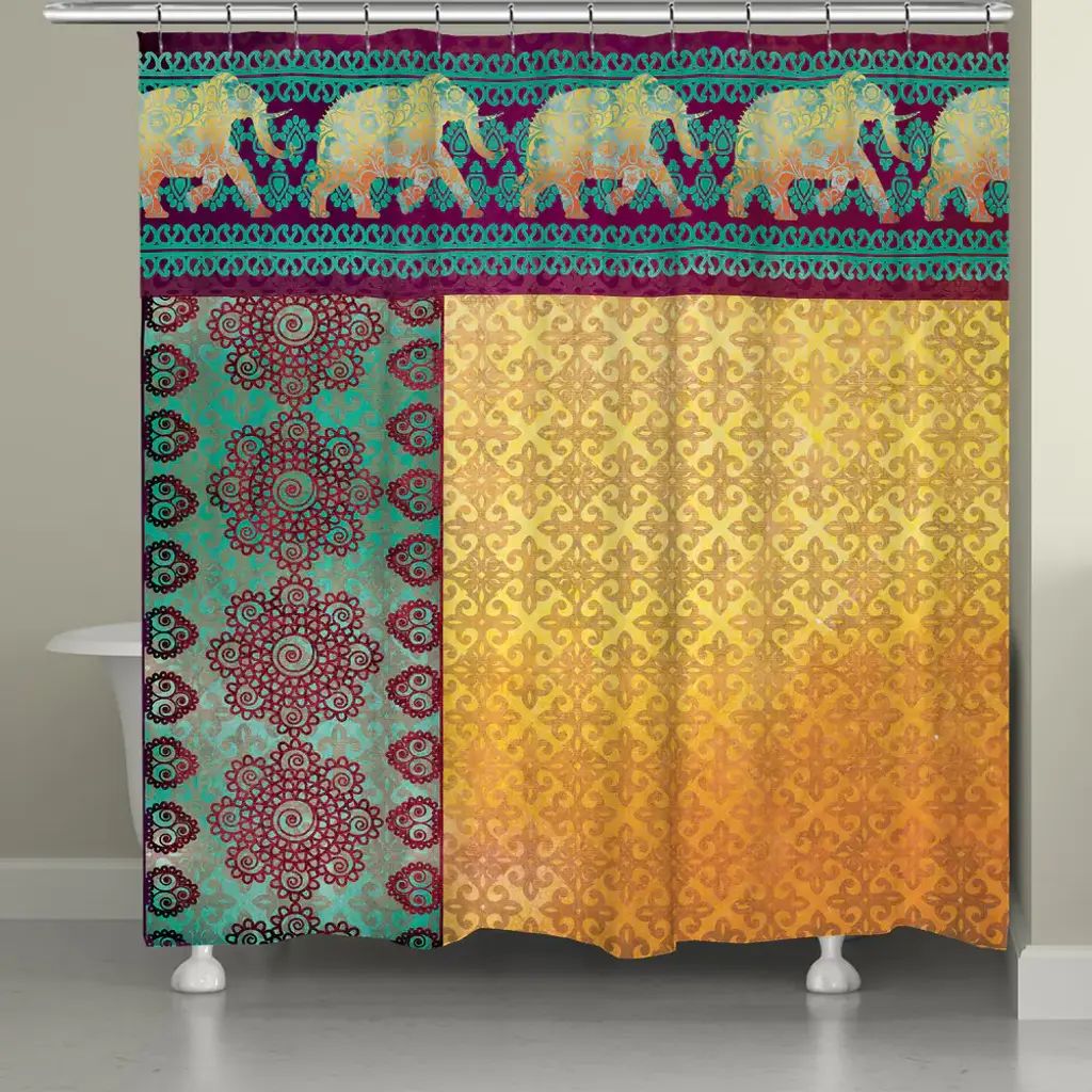 Bright colors and global patterns with a parade of elephants marching across the top border. Add some boho flair to your bathroom with Laural Home's "Marrakesh Shower Curtain."All of our products are digitally printed to create crisp, vibrant colors and images. Imported. Please allow 5-7 days for items to ship.Artist: Christine Adolph Bright colors and global patterns with a parade of elephants marching across the top border. Add some boho flair to your bathroom with Laural Home's "Marrakesh Shower Curtain."All of our products are digitally printed to create crisp, vibrant colors and images. Imported. Please allow 5-7 days for items to ship.Artist: Christine Adolph