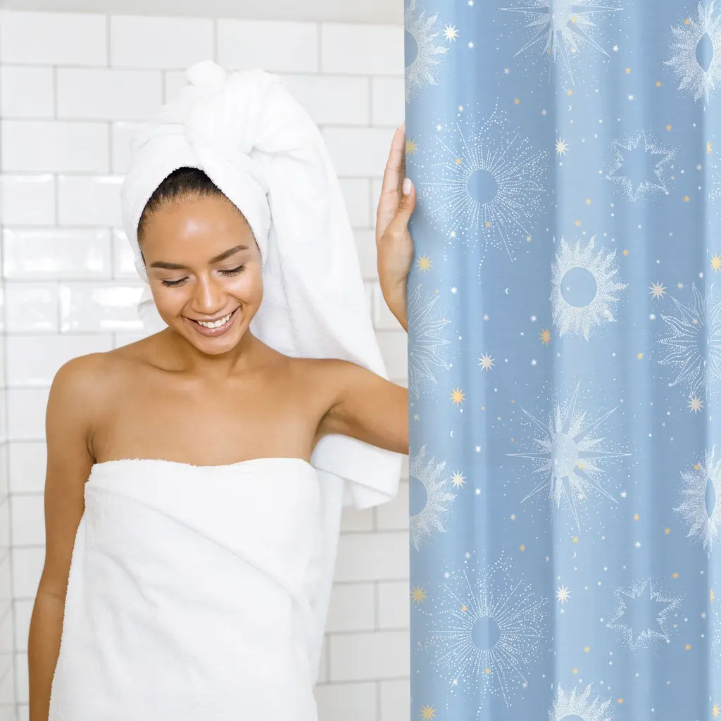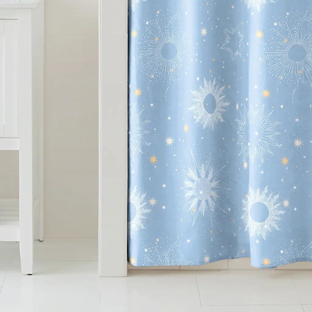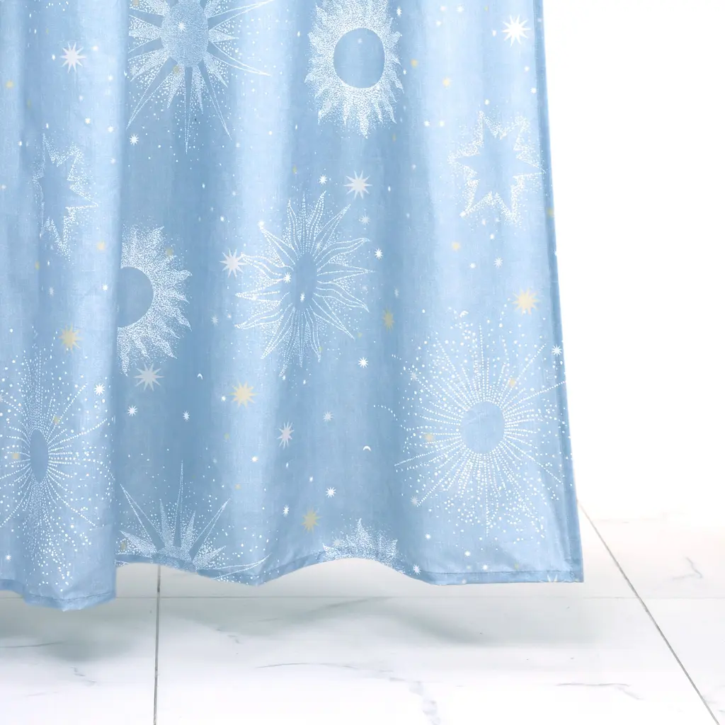 Create a divine cosmic haven with the Uriel Shower Curtain by Lemon Tree. The allover celestial print will bring a sense of otherworldliness to your bathroom. Coordinates with the Uriel Reversible Comforter Set.