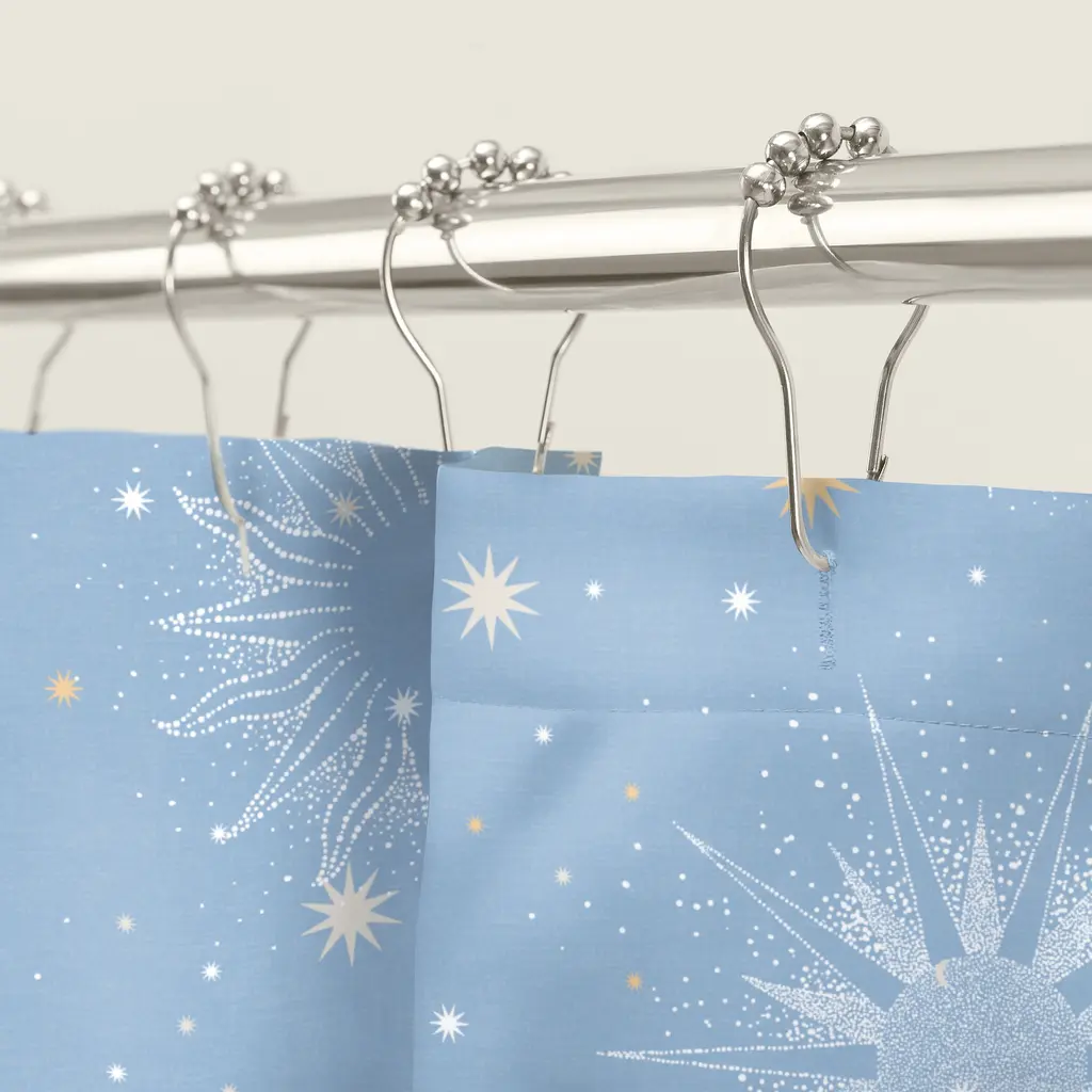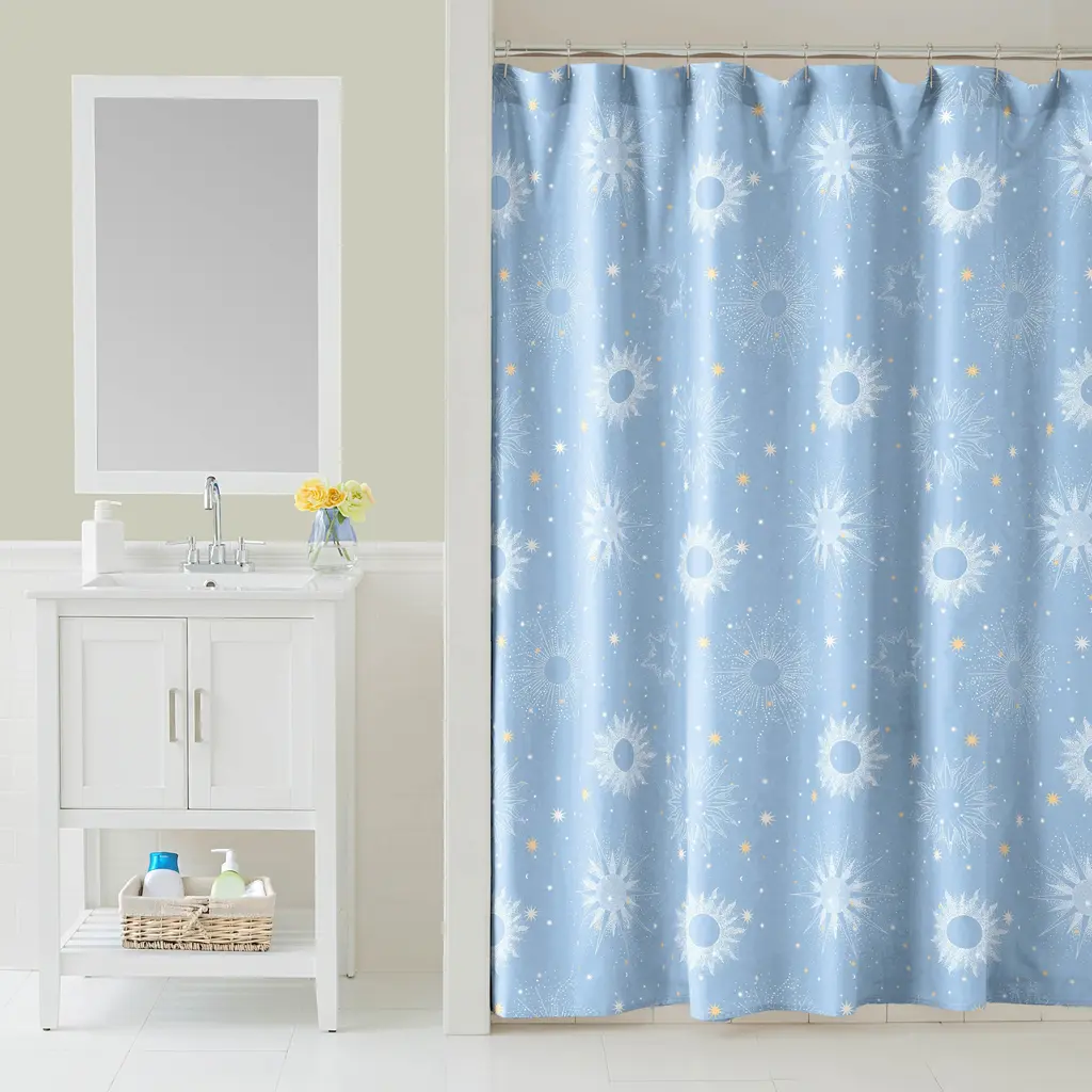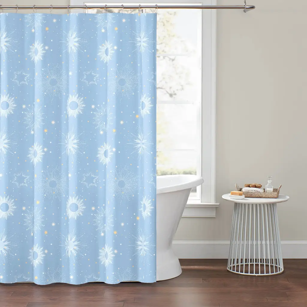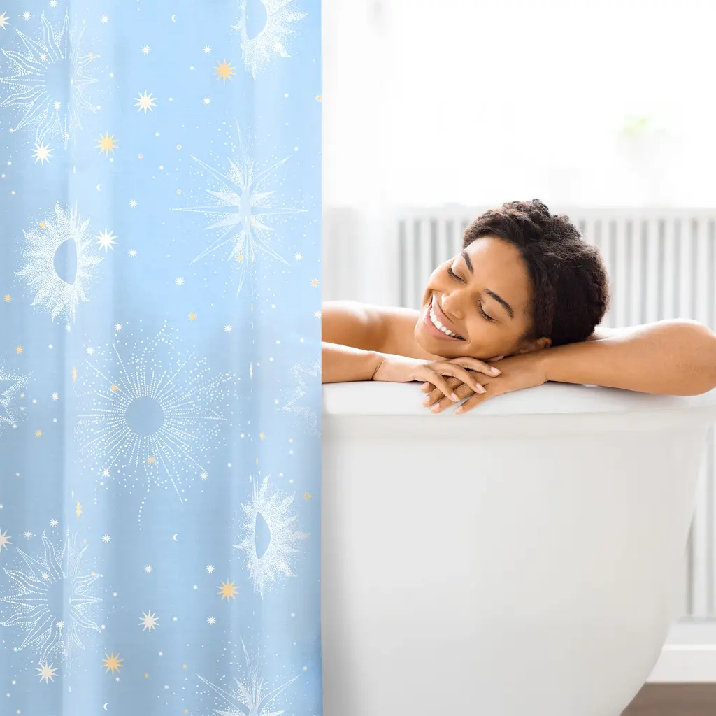 Create a divine cosmic haven with the Uriel Shower Curtain by Lemon Tree. The allover celestial print will bring a sense of otherworldliness to your bathroom. Coordinates with the Uriel Reversible Comforter Set.