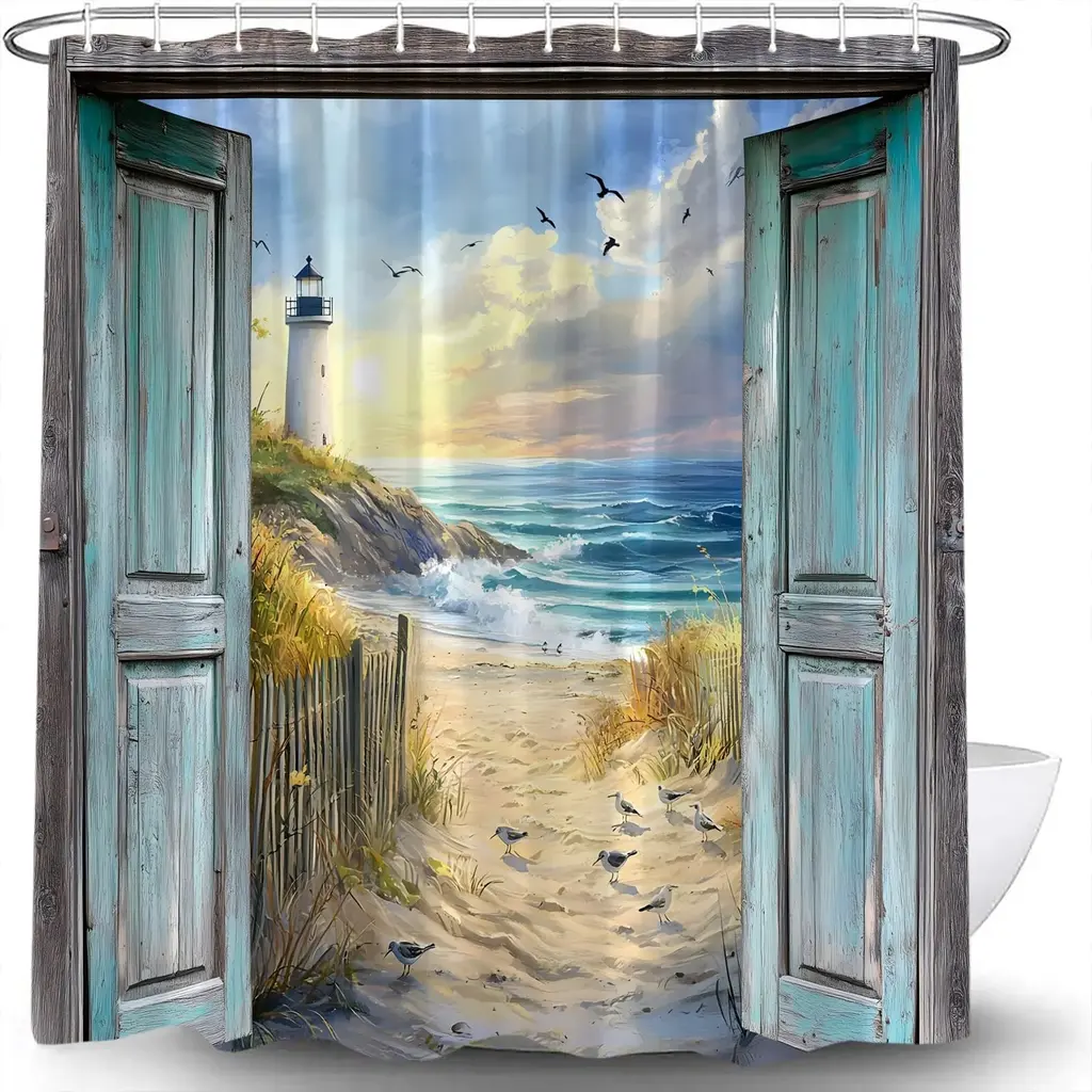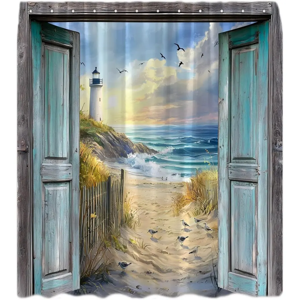 Bring the beauty of the coast into your bathroom with the Lighthouse Shower Curtain, featuring a stunning ocean beach seascape design. The serene imagery of a towering lighthouse overlooking rolling waves and a sandy shoreline creates a peaceful, nautical atmosphere. Perfect for coastal, beach house, or maritime-inspired decor, this curtain adds a refreshing touch to your space. Made from durable, water-resistant fabric, it offers both style and function, turning your shower into a tranquil seaside escape.