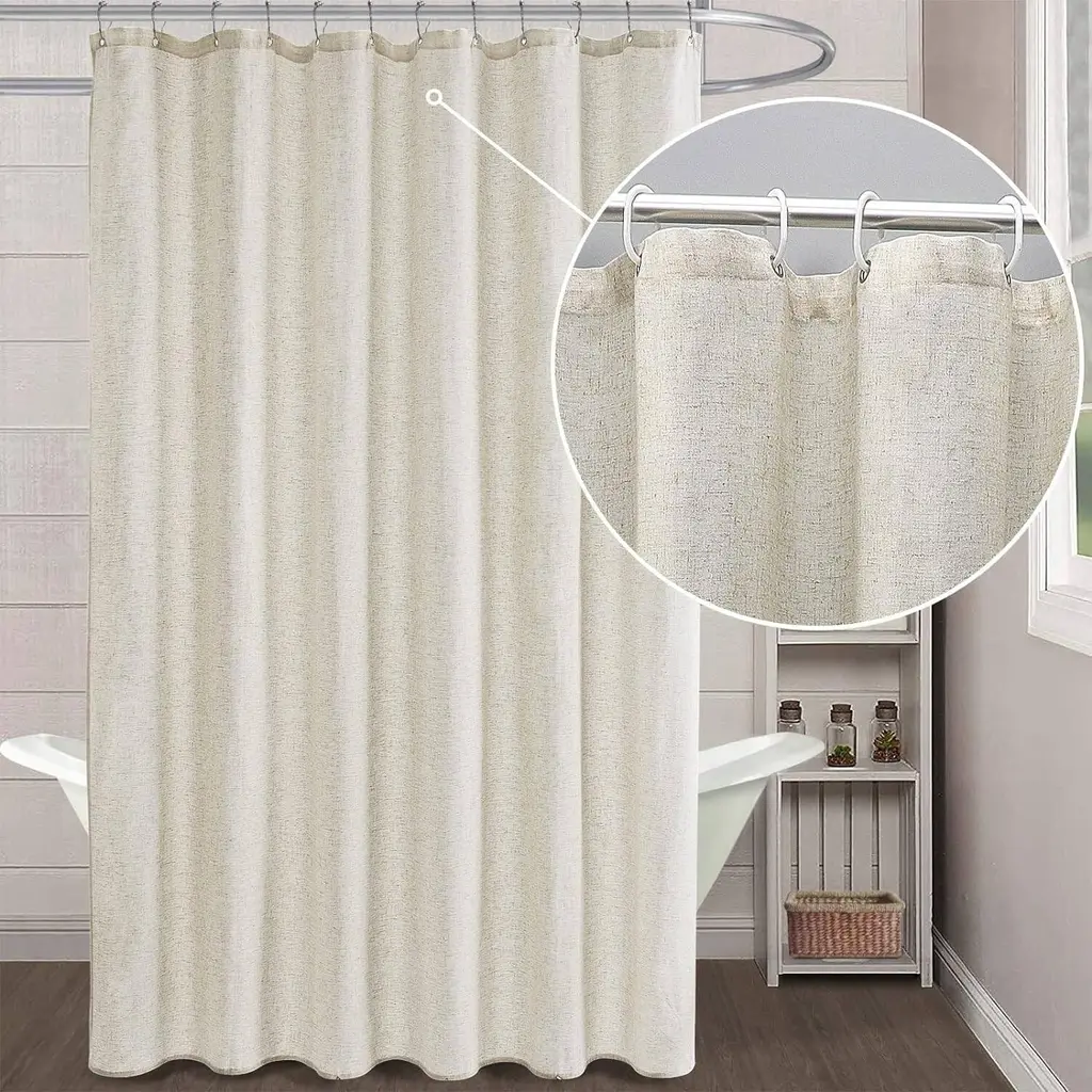 Fabric: Woven from natural linen material, avoid synthetic materials, skin-friendly and non-irritating, the special weaving process makes the shower curtain soft, easy to wash, and not easy to wrinkle. Privacy :Not see through/semi sheer and privacy assured fabric perfectly making the shower curtain an alternative to frosted clear shower curtain.Lightweight and airy only from fabric. Farmhouse & Boho Bathroom Decor:Simple,clean and natural touch elegant for modern boho,rustic,modern farmhouse bathroom decor. Neutral Tone & Textured Fabric:Bring a soothing,comfortable and relaxing bath experience while complementing bathroom accessories and wall. Package & Care Instruction:Includes 1 panel shower curtain with reinforced meta grommet holes.12 white hooks for easy sliding on shower curtain rod.Machine washable.No bleach.Tumble dry low.Iron with low temperature.