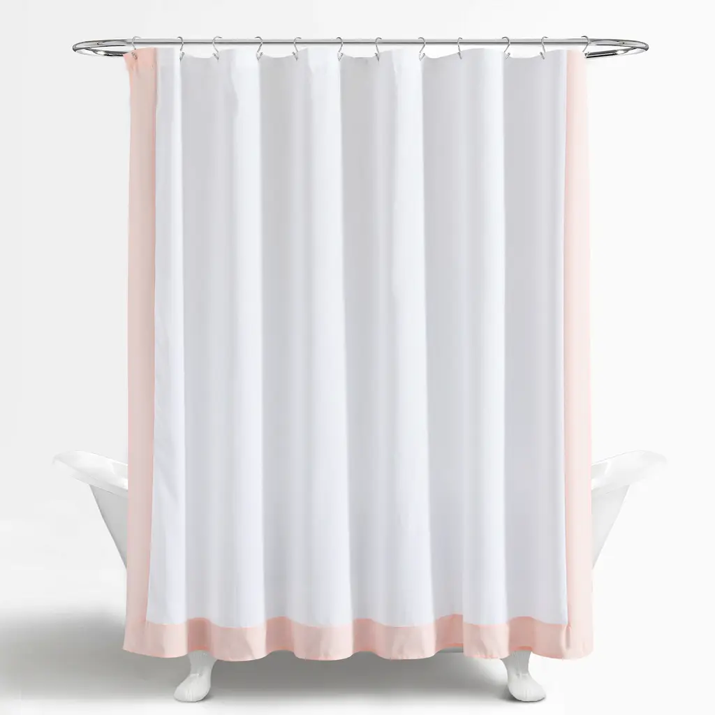 Brighten your bathroom look with the sleek design of this STANDARD 100 by OEKO-TEX® certified shower curtain. The block border adds a pop of color to your space in a modern way. This curtain can easily be styled and coordinated with your exisiting decor.Elevate your bathroom style with this modern shower curtain. With a stylish block border design, this two-toned shower curtain is perfect for contemporary bathrooms. It's easy to style and hangs beautifully with complementing decor, making your daily shower experience that much more enjoyable. Add it to your list of must-haves for a quick and easy guest or primary bathroom update! This shower curtain measures 72 inches on each side and should fit most standard bathtubs. Please refer to label for full care instructions. Features: