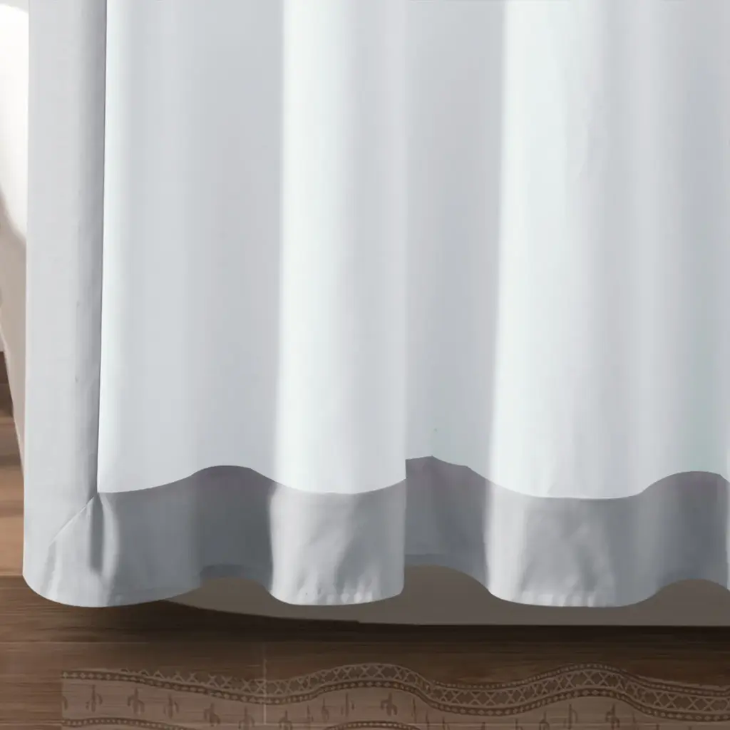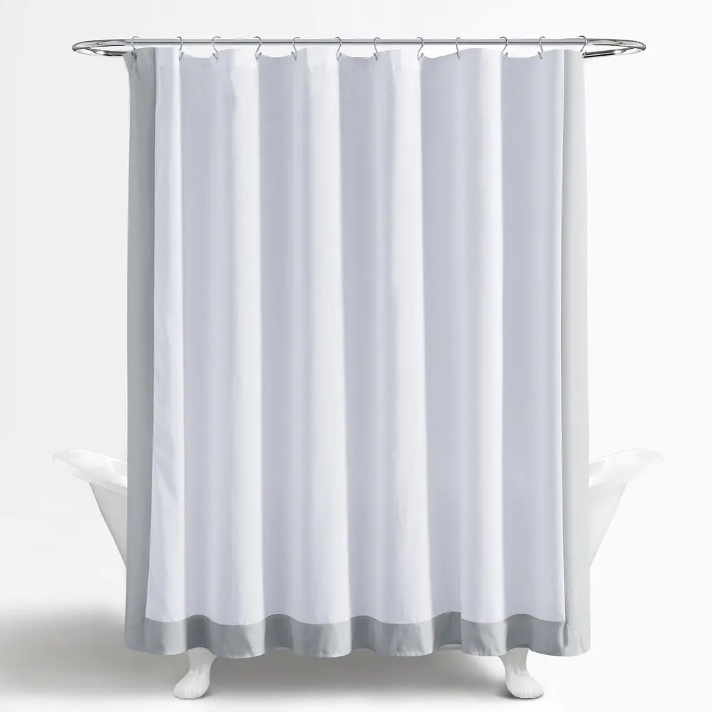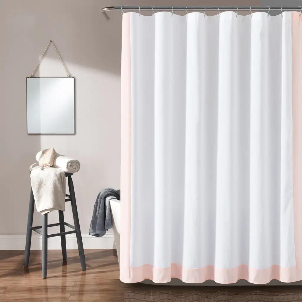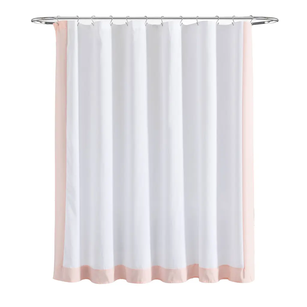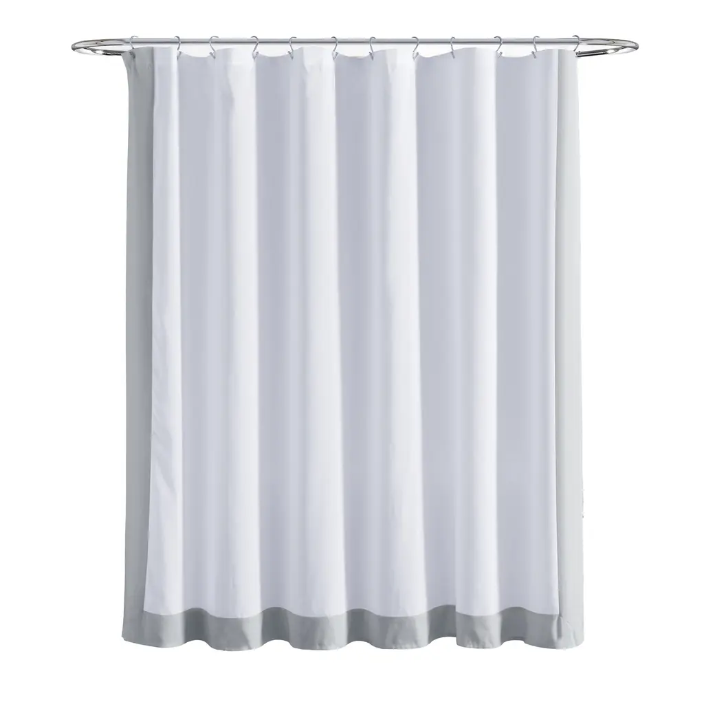 Brighten your bathroom look with the sleek design of this STANDARD 100 by OEKO-TEX® certified shower curtain. The block border adds a pop of color to your space in a modern way. This curtain can easily be styled and coordinated with your exisiting decor.Elevate your bathroom style with this modern shower curtain. With a stylish block border design, this two-toned shower curtain is perfect for contemporary bathrooms. It's easy to style and hangs beautifully with complementing decor, making your daily shower experience that much more enjoyable. Add it to your list of must-haves for a quick and easy guest or primary bathroom update! This shower curtain measures 72 inches on each side and should fit most standard bathtubs. Please refer to label for full care instructions. Features: