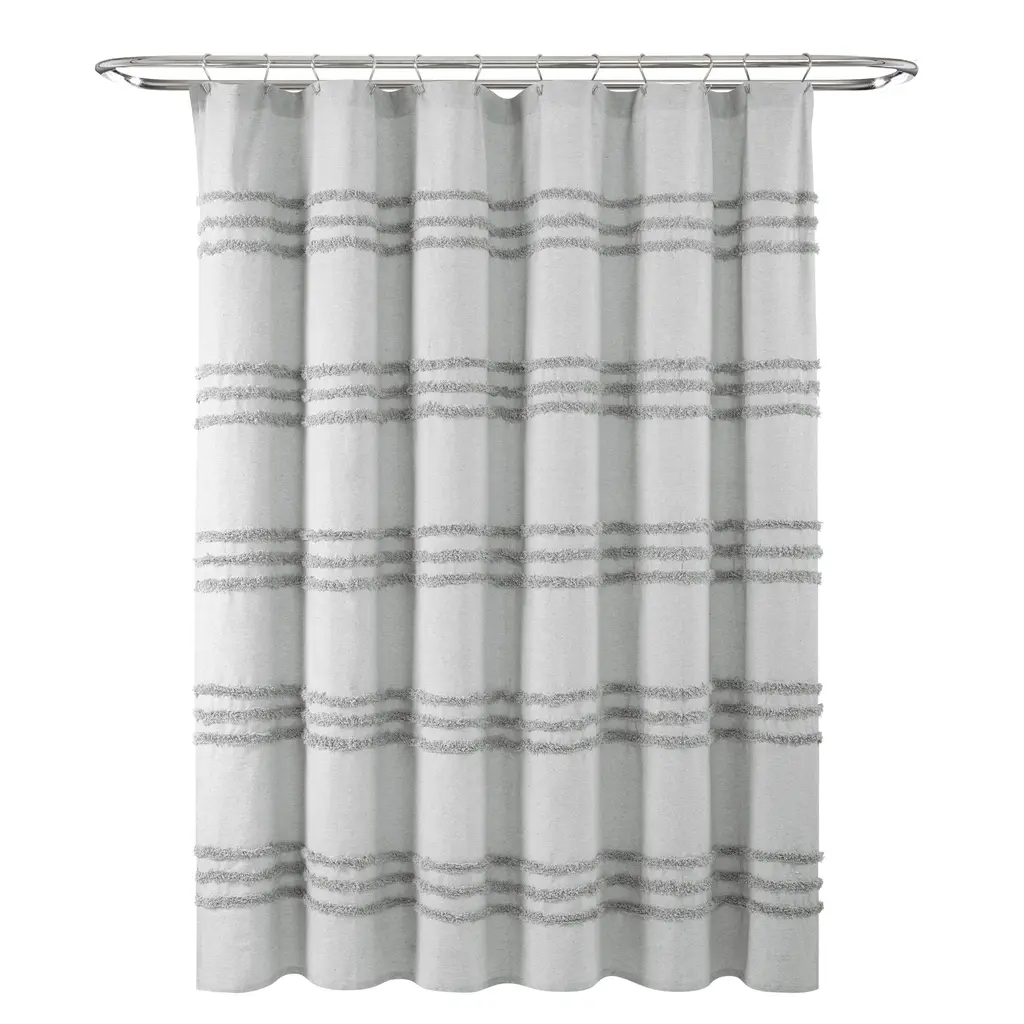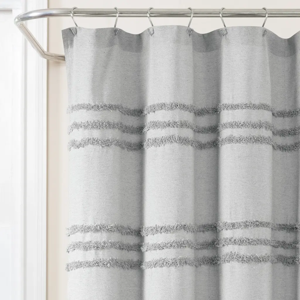 Update your bathroom design with some texture! This yarn dyed shower curtain enhances your space with simple stripes that make a stylish impact and easily coordinates with existing decor, while the recycled cotton fabric helps the environment.Create a space that reflects a style as unique as your character. Made with eco-friendly recycled cotton, this yarn-dyed textured tufted shower curtain will add chic boho vibes to your bathroom decor. With its unique style and dimensional stripe pattern, you'll love coordinating this piece with similar accessories to show off your eclectic personality. This shower curtain measures 72 inches on each side and should fit most standard bathtubs. 12 button holes line the top for easy hanging with any rings or hooks (not included). Please refer to label for full care instructions. Features: