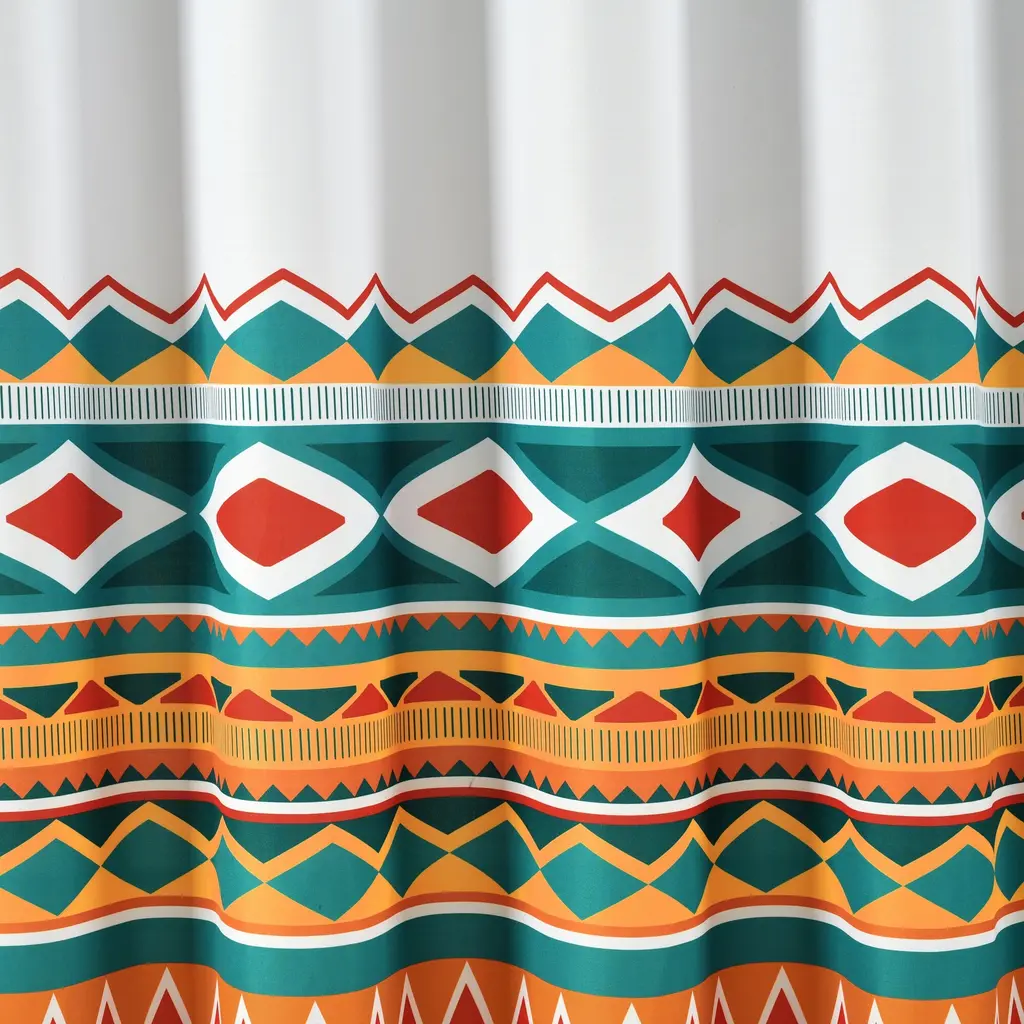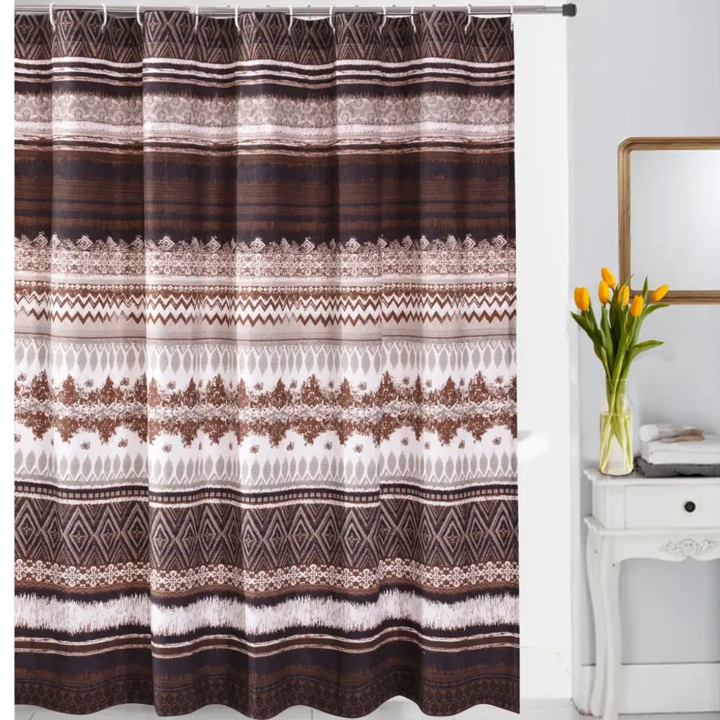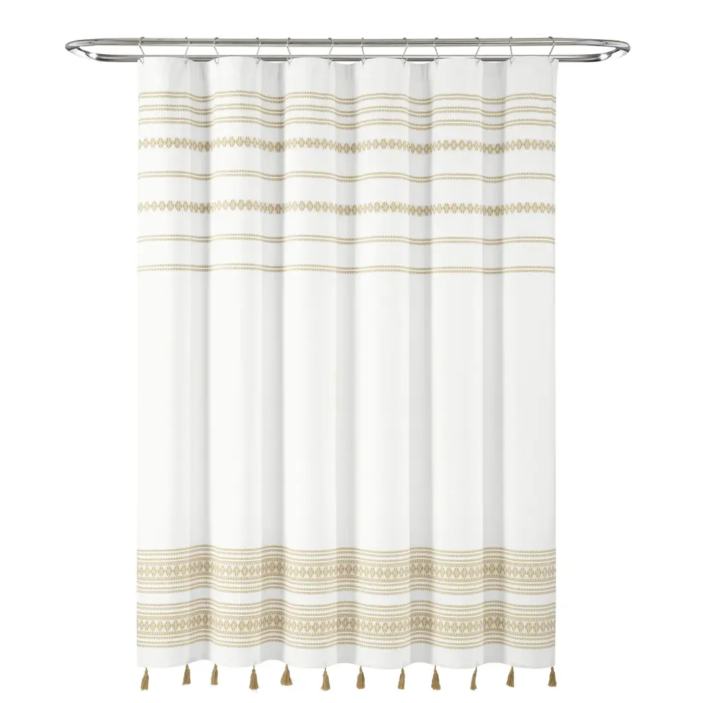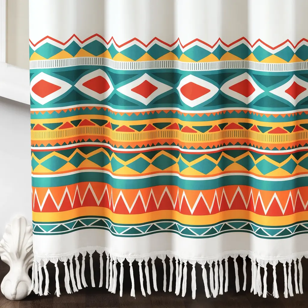 This shower curtain combines eclectic boho colors with classic a southwest pattern. Give your bathroom a pop of color and unique style when you hang this decorative curtain up! The bottom is edged with a bohemian inspired tassel fringe.Your bathroom is about to hold one of your favorite pieces of decor! This shower curtain brings eclectic character with its mashup of boho chic colors and prime southwest patterns. Hanging this shower curtain in your guest or primary bathroom will give you the makeover and pop of color you didn't know you needed. The bottom hem of the curtain features a lovable fringe detailing perfect for both bohemian and southwest styles. This curtain measures 72 inches across and hangs 70 inches down with an added 2.5 inches of tassel fringe at the bottom. Please refer to label for full care instructions.Features: