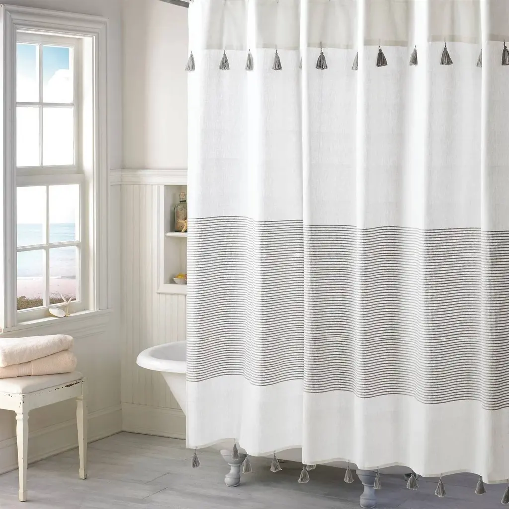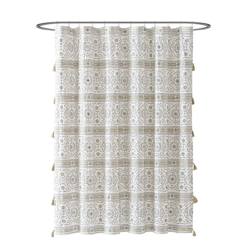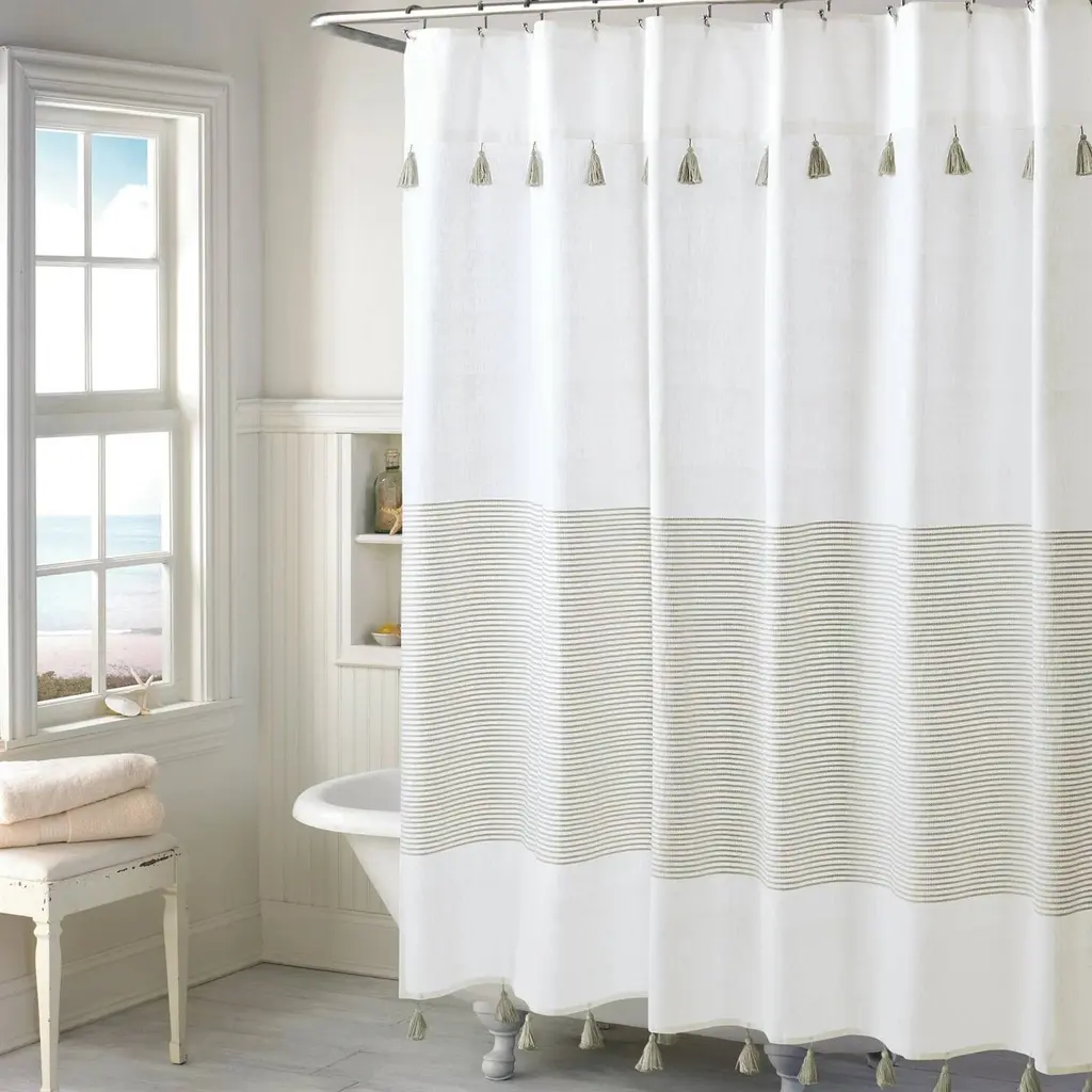 Liven up your bathroom decor with this textural GRS certified recycled cotton shower curtain. Featuring a woven jacquard stripe pattern with matching decorative tassels hanging from the bottom, this piece is sure to add some bohemian flair to your home.Add this chic Aztec inspired shower curtain to your primary, guest, or teen's bathroom. This curtain has a white base with a neutral colored intricate woven jacquard pattern that displays different geometric stripes accented with matching colored tassels at the bottom. The textured design and charming tassel detail will give your space new life. The eco-friendly recycled cotton makes this a purchase you can feel good about. The shower curtain measures 72 inches by 72 inches. It will hang easily with any standard shower curtain rings or hooks (sold separately). This product contains 100% GRS certified recycled material, certified by GSCI. Please refer to the care label for full instructions before washing.Features: