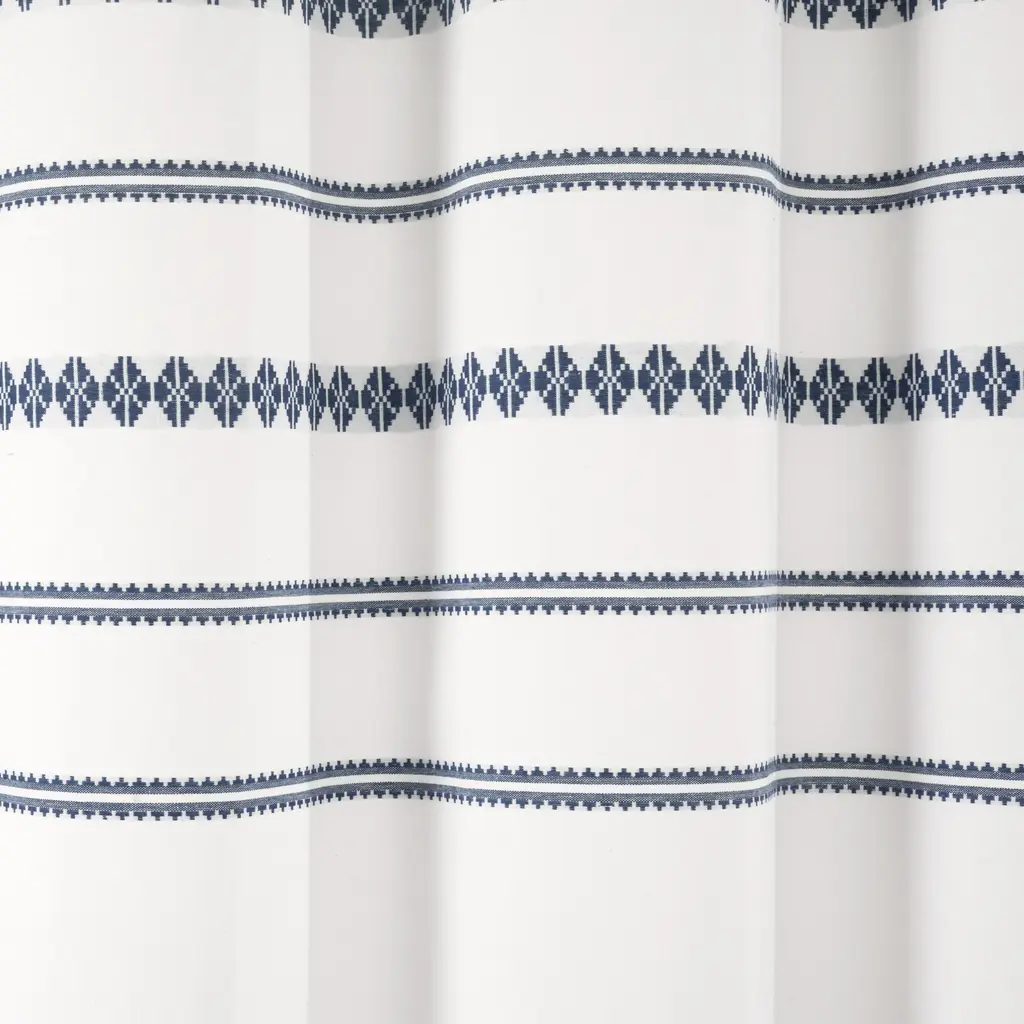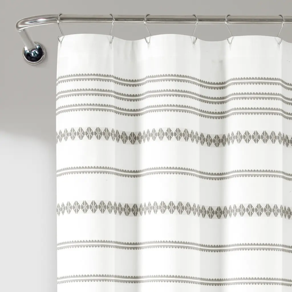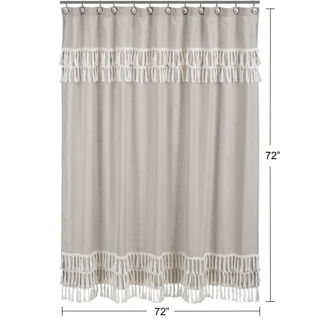 Liven up your bathroom decor with this textural GRS certified recycled cotton shower curtain. Featuring a woven jacquard stripe pattern with matching decorative tassels hanging from the bottom, this piece is sure to add some bohemian flair to your home.Add this chic Aztec inspired shower curtain to your primary, guest, or teen's bathroom. This curtain has a white base with a neutral colored intricate woven jacquard pattern that displays different geometric stripes accented with matching colored tassels at the bottom. The textured design and charming tassel detail will give your space new life. The eco-friendly recycled cotton makes this a purchase you can feel good about. The shower curtain measures 72 inches by 72 inches. It will hang easily with any standard shower curtain rings or hooks (sold separately). This product contains 100% GRS certified recycled material, certified by GSCI. Please refer to the care label for full instructions before washing.Features: