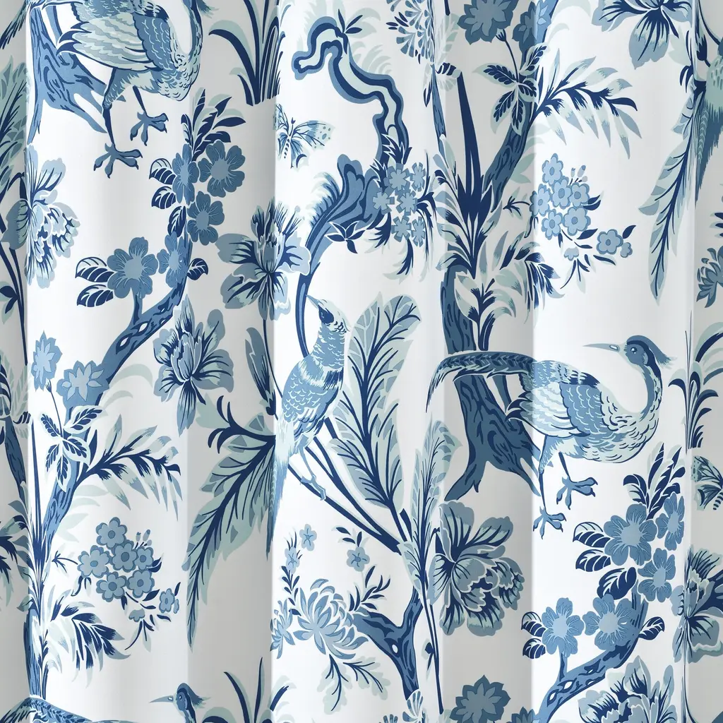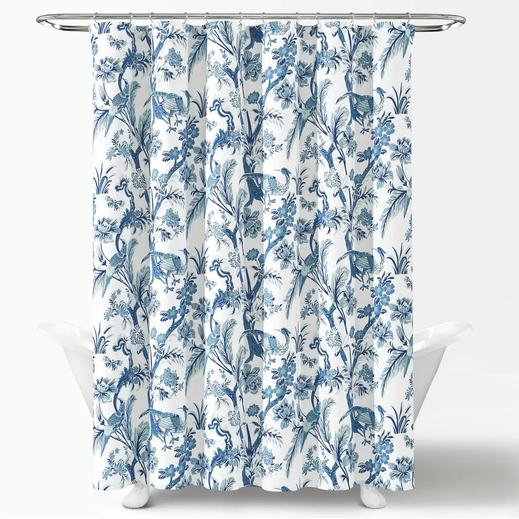This dazzling shower curtain features a printed pattern of peacocks, unique leaves, and flowers for a bold and stunning look. The distinctive pattern of this shower curtain will be the centerpiece of your master bathroom or guest bathroom renovation.This pattern of birds and florals is one you won't find anywhere else. It's the perfect look for a maximalist design theme. The bright colors truly pop. This shower curtain measures 72 inches on each side. It hangs easily with any standard shower curtain rings or hooks, which are sold separately. For your convenience, this shower curtain is safe to machine wash and tumble dry. Refer to the care label for full instructions.Features: