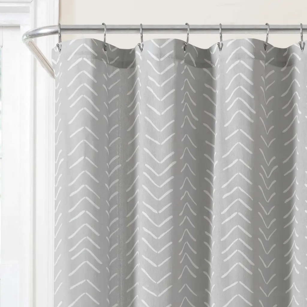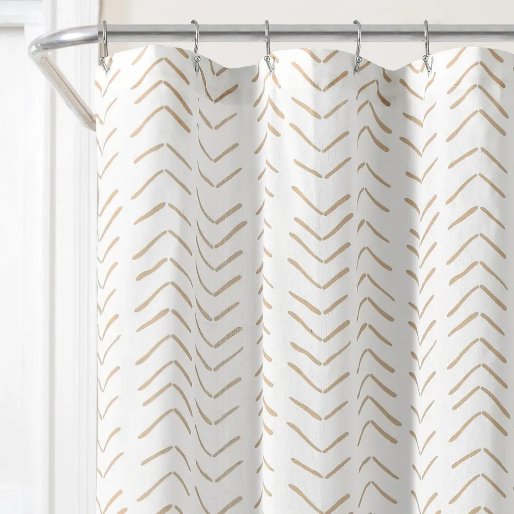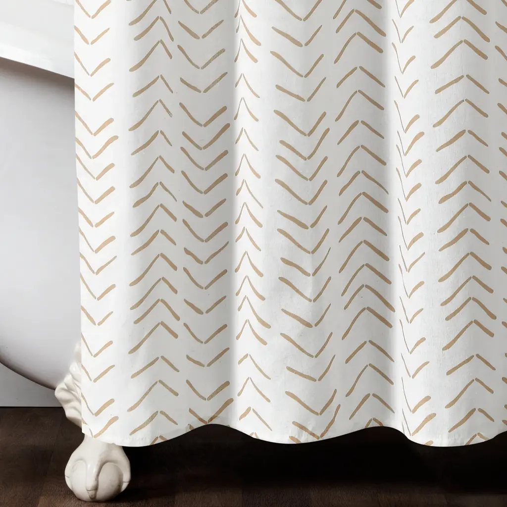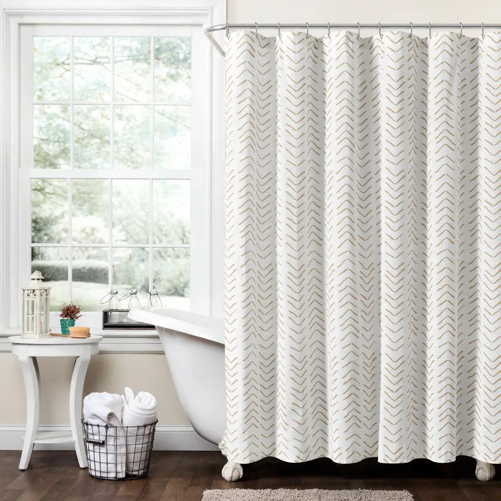 Make every morning a relaxing one and decorate your primary bathroom with the simple look of this hygge themed shower curtain. Rows of arrows line the linen look of this soft shower curtain. The introduction of color complements many different styles.Make your bathroom feel like a luxury spa with this stylish shower curtain. With its simple and modern design, this shower curtain is perfect for adding a calming hygge touch to your bathroom decor. The white and contrasting color scheme is also super versatile and can easily be styled into your space. The cotton blend is soft with a luxurious linen look. This shower curtain measures 72 inches along each side and should fit most standard bathtubs. Please refer to label for full care instructions. Coordinates with our Hygge Modern Arrow Linen Like Window Curtain Panels.Features: