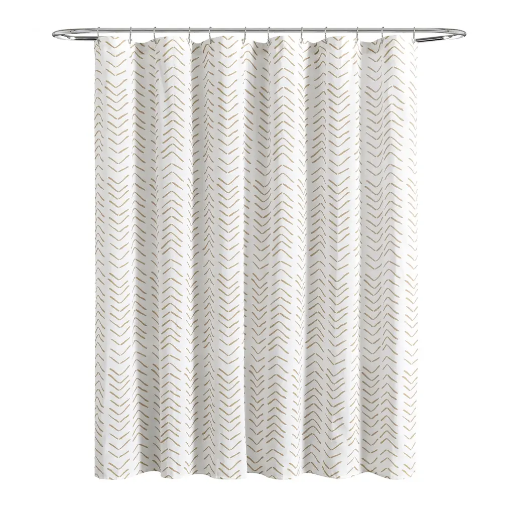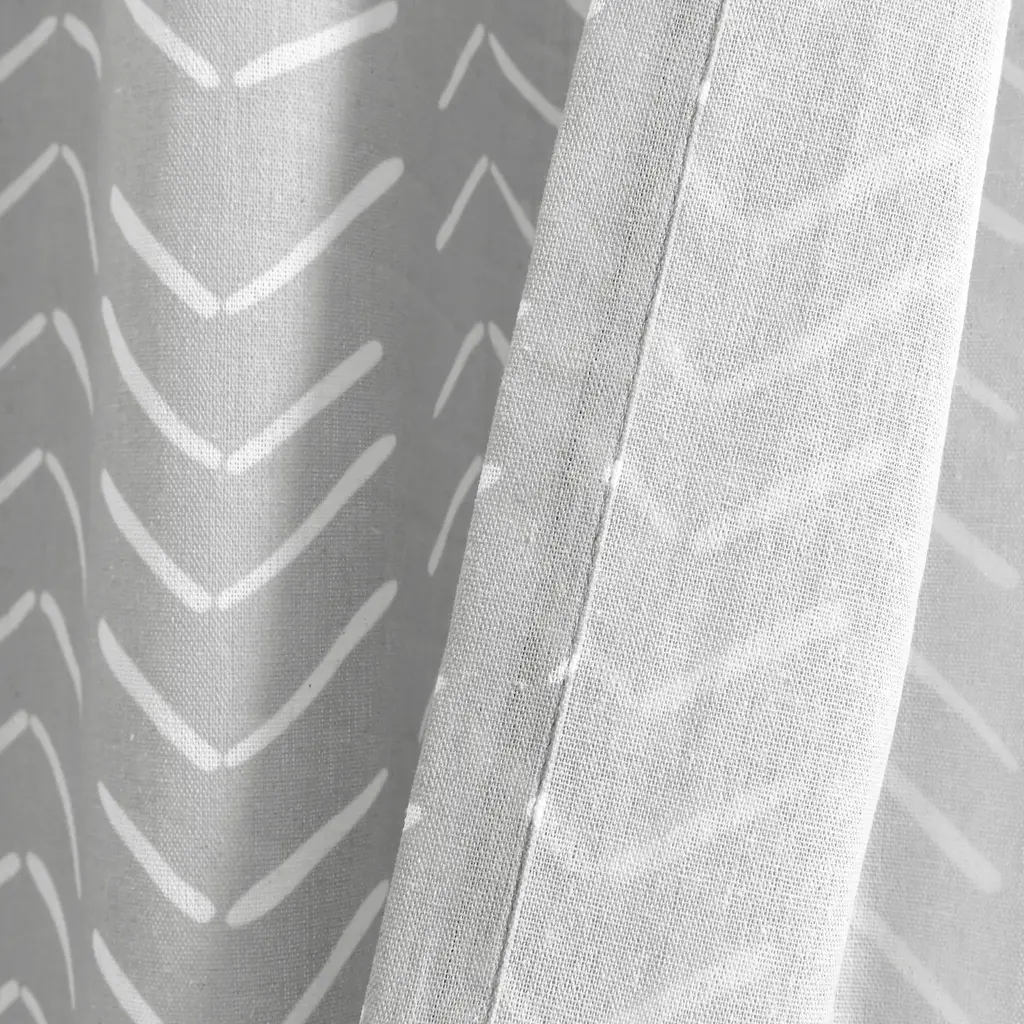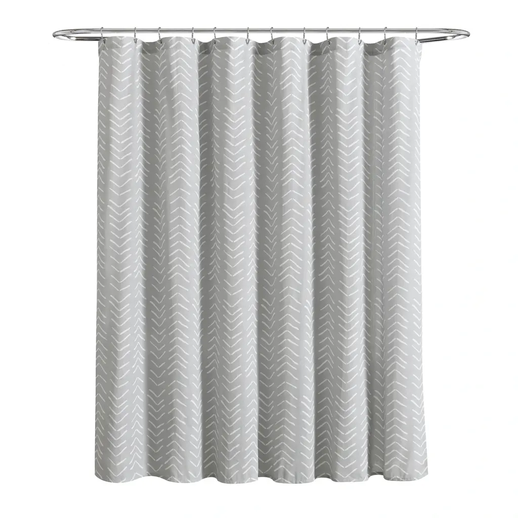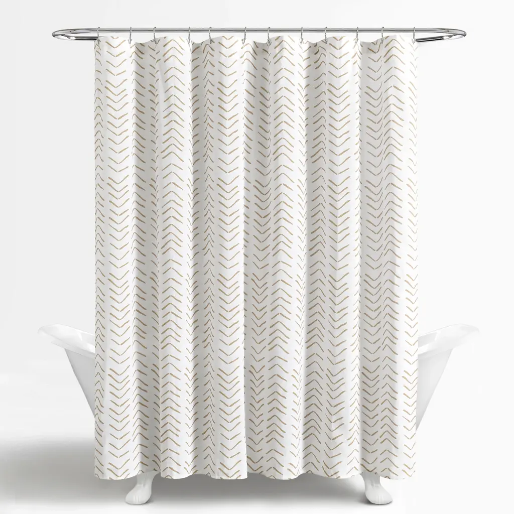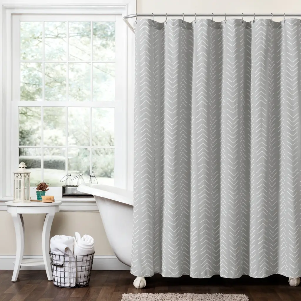 Make every morning a relaxing one and decorate your primary bathroom with the simple look of this hygge themed shower curtain. Rows of arrows line the linen look of this soft shower curtain. The introduction of color complements many different styles.Make your bathroom feel like a luxury spa with this stylish shower curtain. With its simple and modern design, this shower curtain is perfect for adding a calming hygge touch to your bathroom decor. The white and contrasting color scheme is also super versatile and can easily be styled into your space. The cotton blend is soft with a luxurious linen look. This shower curtain measures 72 inches along each side and should fit most standard bathtubs. Please refer to label for full care instructions. Coordinates with our Hygge Modern Arrow Linen Like Window Curtain Panels.Features: