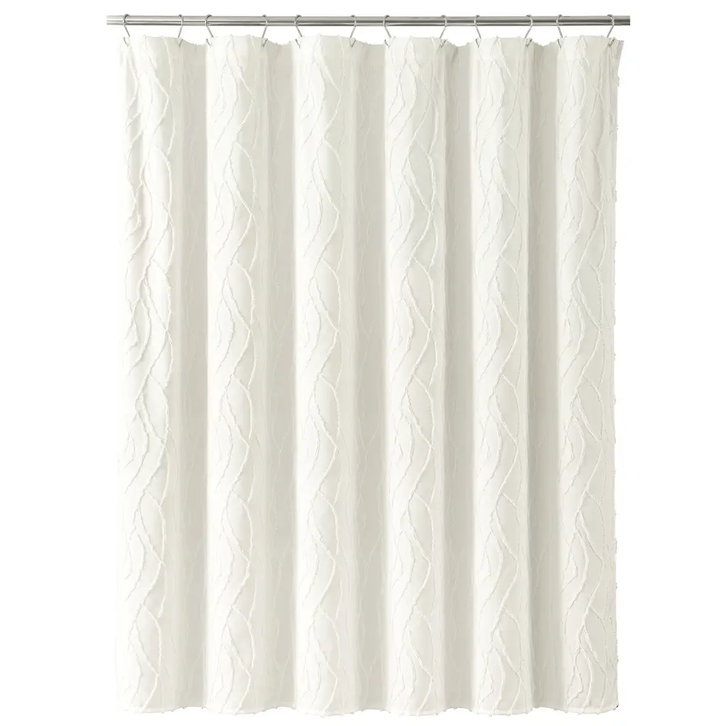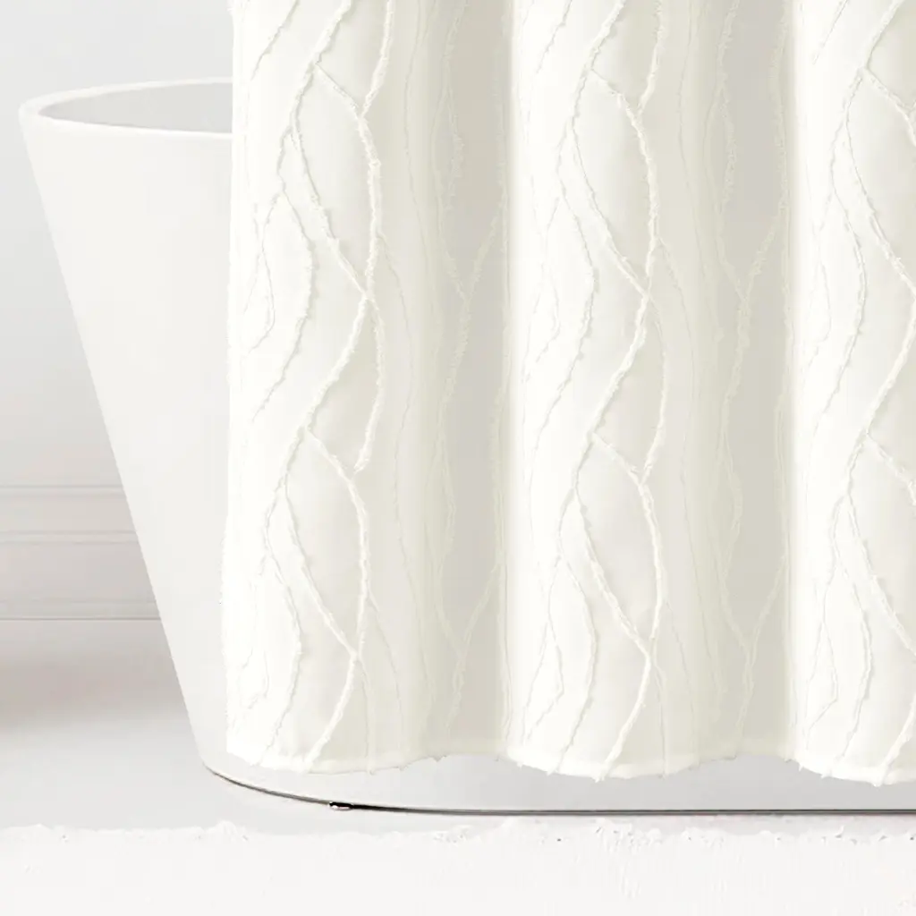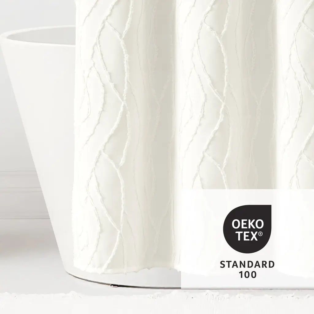 Embellished with a unique wave pattern, this Jacquard Wave Shower Curtain brightens your bathroom with tufted texture and a simple design. This white shower curtain is a great addition to a modern, boho, coastal, or cottage style bathroom. Add dimension to your primary or guest bathroom with this unique clip jacquard curtain, bringing a light and relaxing style to your space. The solid white color and textured design makes it easy to style with your existing decor. This coastal shower curtain measures 72 inches wide by 72 inches long. The prewashed microfiber fabric ensures long lasting softness and prevents shrinking. The 12 button holes at the top of this shower curtain make it easy to hang with hooks or rings, ensuring a simple installation process. Because this is a fabric shower curtain, we recommend pairing it with a liner, sold separately. This shower curtain is STANDARD 100 by OEKO-TEX® certified, which means the fabric, dyes and all components have been tested in an independent laboratory and certified against a list of more than 350 harmful substances. To care for this shower curtain, simply machine wash and tumble dry low. Please refer to label for full care instructions.