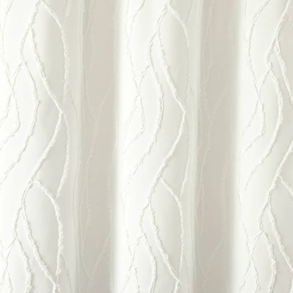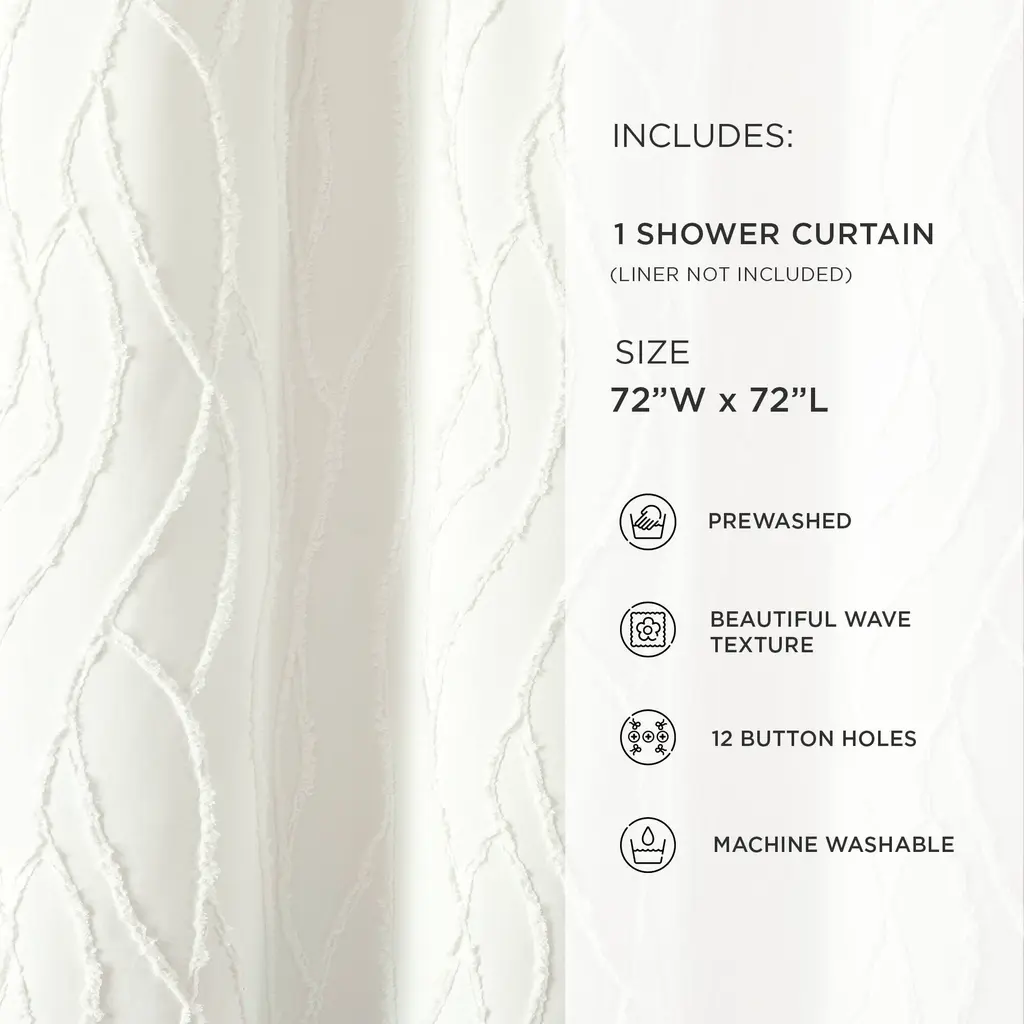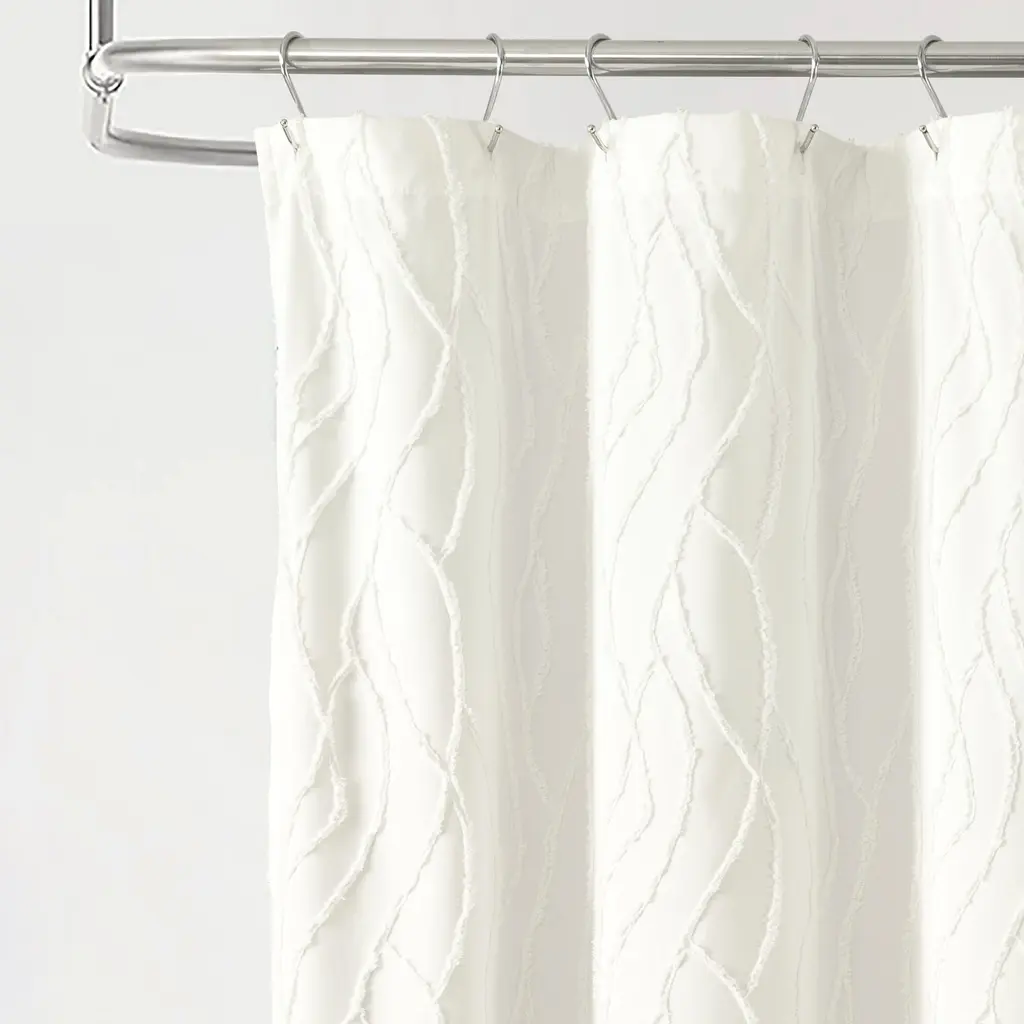Embellished with a unique wave pattern, this Jacquard Wave Shower Curtain brightens your bathroom with tufted texture and a simple design. This white shower curtain is a great addition to a modern, boho, coastal, or cottage style bathroom. Add dimension to your primary or guest bathroom with this unique clip jacquard curtain, bringing a light and relaxing style to your space. The solid white color and textured design makes it easy to style with your existing decor. This coastal shower curtain measures 72 inches wide by 72 inches long. The prewashed microfiber fabric ensures long lasting softness and prevents shrinking. The 12 button holes at the top of this shower curtain make it easy to hang with hooks or rings, ensuring a simple installation process. Because this is a fabric shower curtain, we recommend pairing it with a liner, sold separately. This shower curtain is STANDARD 100 by OEKO-TEX® certified, which means the fabric, dyes and all components have been tested in an independent laboratory and certified against a list of more than 350 harmful substances. To care for this shower curtain, simply machine wash and tumble dry low. Please refer to label for full care instructions.