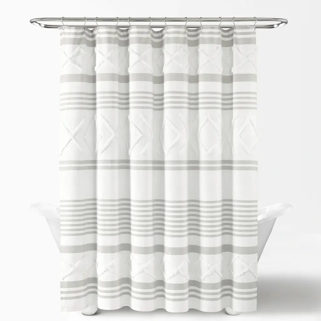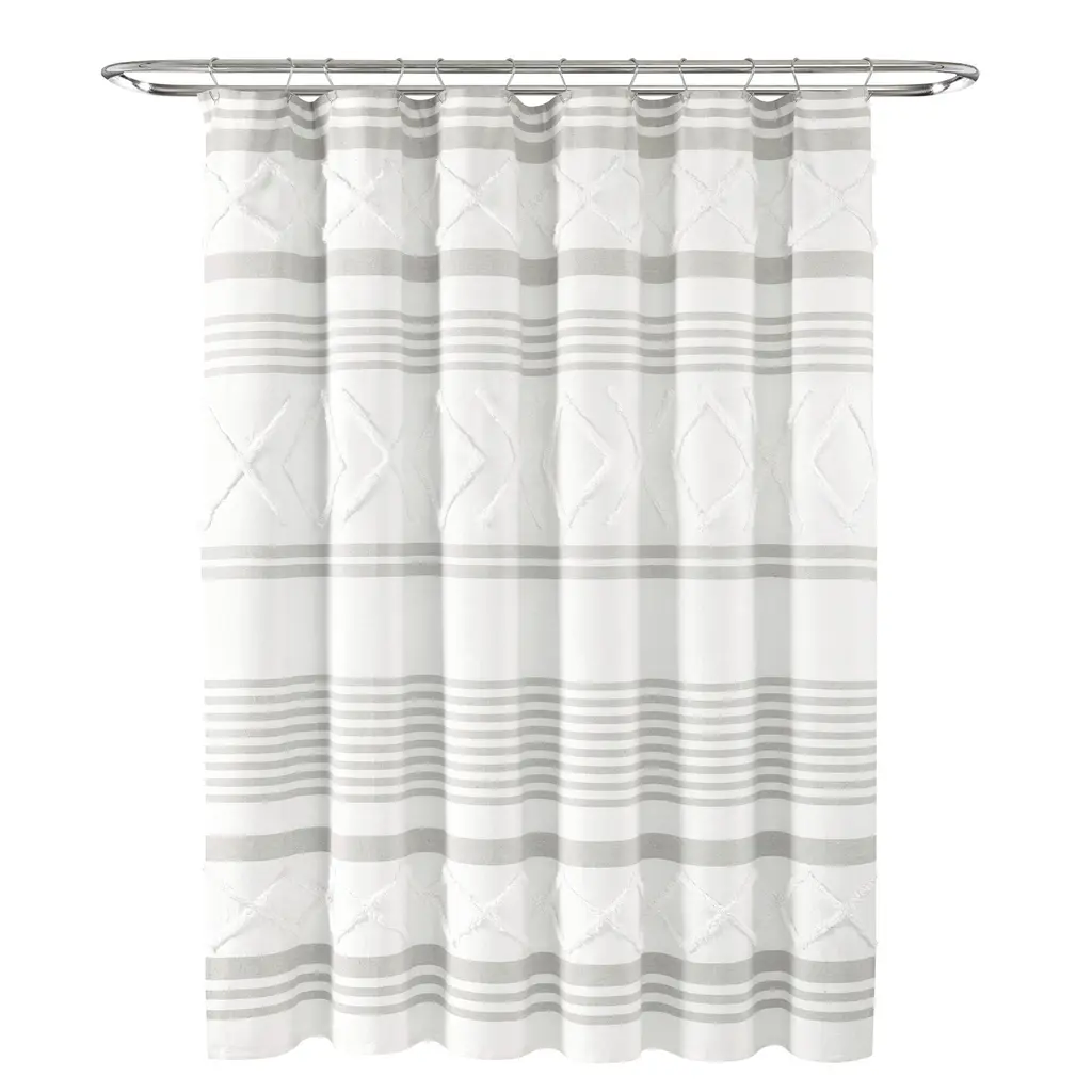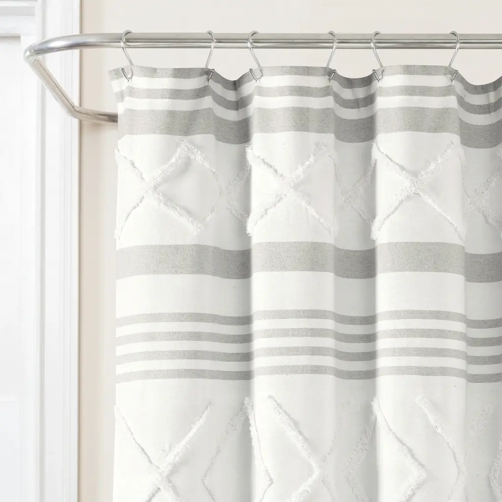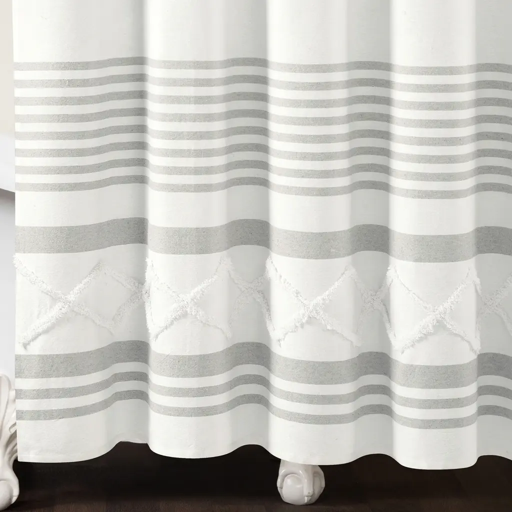 Start your morning routine in a relaxing, well-decorated bathroom when you hang this textured shower curtain. Tufted in a diamond pattern and featuring rows of stripes, this eco-friendly recycled cotton shower curtain will give your bathroom chic style.Take your bathroom from drab to fab with this super stylish woven shower curtain. Made of eco-friendly recycled cotton, this textured decorative curtain is a quick and simple way to add tons of chic style to your primary or guest bathroom. With a tufted diamond design and woven colored stripes, this curtain introduces a new take on a contemporary design by layering classic patterns with dimension. The yarn dyed fabric ensures long lasting color through use and wash. This shower curtain measures 72 inches on each side and should fit most standard bathtubs. 12 button holes line the top for easy hanging with any rings or hooks (not included). Please refer to label for full care instructions.Features: