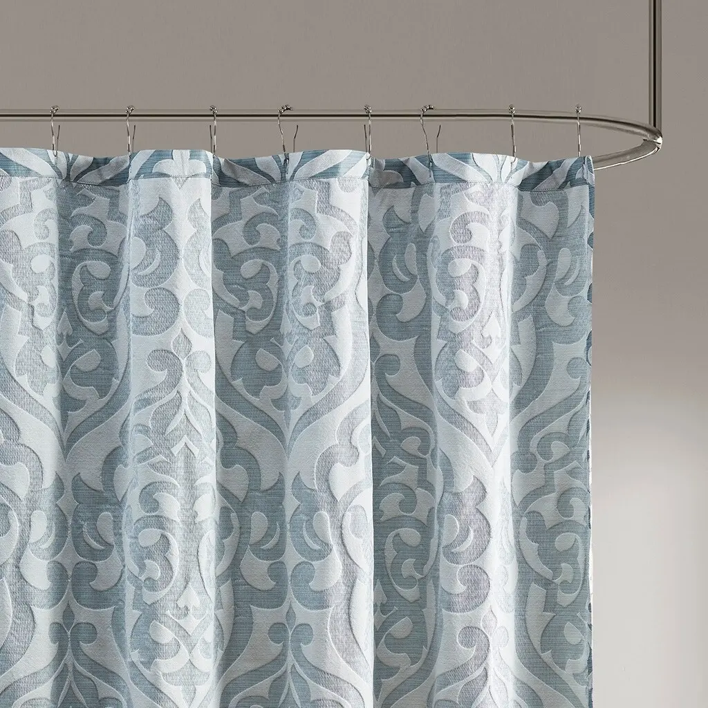 DescriptionAdd a touch of class to your bathroom with our Madison Park Odette Jacquard Shower Curtain. This luxurious textured shower curtain flaunts a gorgeous silver damask medallion design on a stria grey jacquard ground that adds rich texture and dimension to the lavish look. Measuring 72x72", each shower curtain is finished with 12 button holes on top making it easy to assemble hooks and hang onto rod (hooks and rod not included). To better preserve this beautiful shower curtain, a water repellant liner is highly recommended and can be purchased separately (liner not included). Machine washable for easy care; complete the collection with coordinate matching bedding, alas available and sold separately. Product FeaturesProduct Details