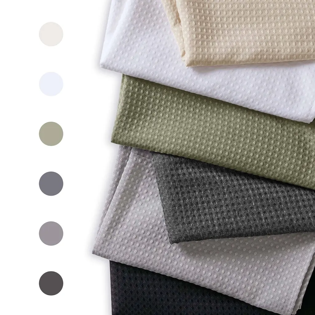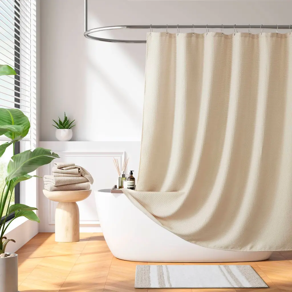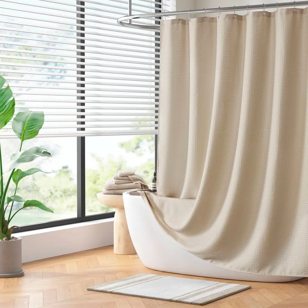 Upgrade your space with our Madison Park Arbor waffle shower curtain, featuring a cationic dyed woven fabric. Designed with grommets for easy hanging, it includes 3M water repellent Scotchgard treatment to keep water off, along with a mold and mildew-resistant treatment for added protection. Crafted from 100% polyester, this shower curtain for bathrooms ensures both durability and a sleek look. Measuring 72"W x 72"L, the textured waffle weave adds style to any bathroom, while its practical features provide lasting performance and a fresh, clean environment.