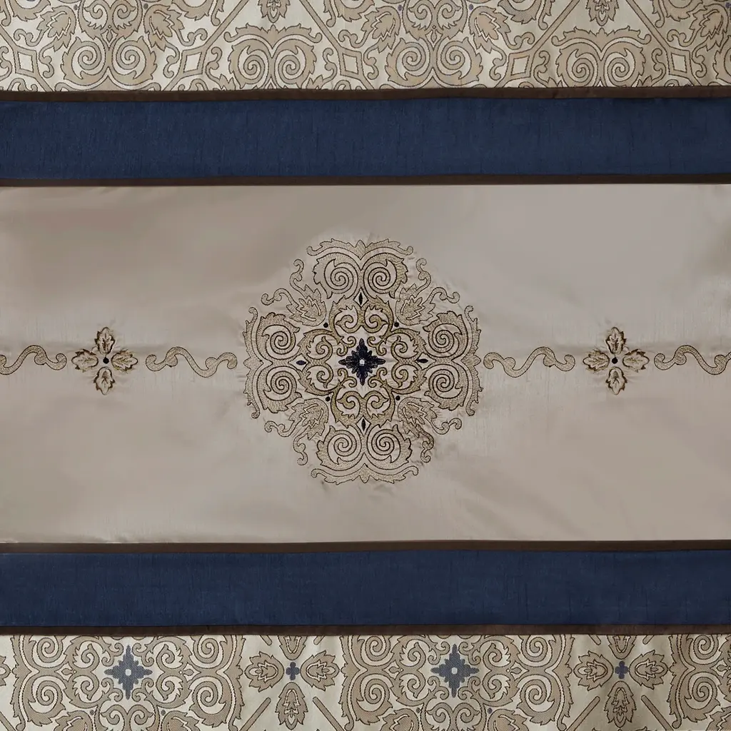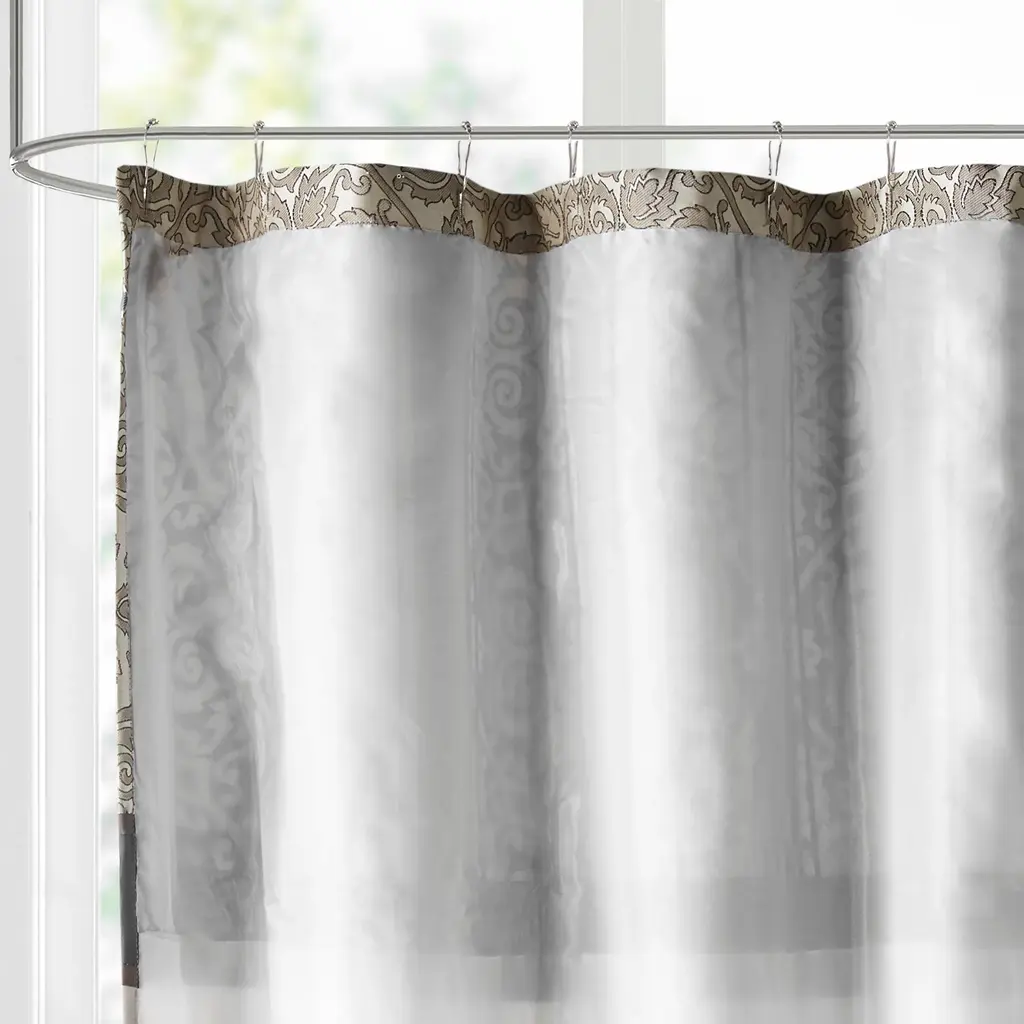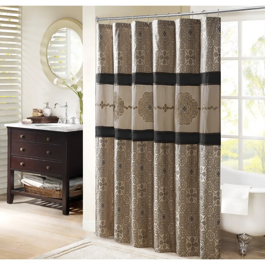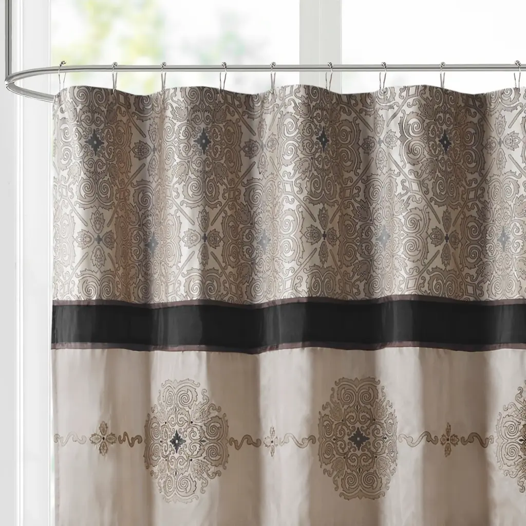 This Madison Park shower curtain features a bold color blocked look with embroidery details. The jacquard weave shows off a medallion design to provide a whole new look to your decor. Features:Dimensions: