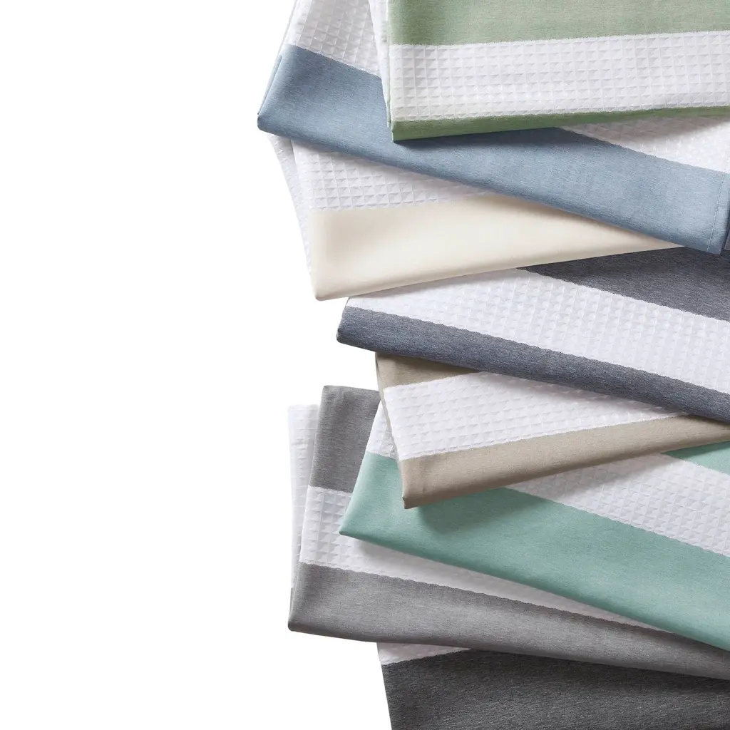Experience a spa-like ambiance in your bathroom with the Madison Park Spa Waffle Shower Curtain. Made of durable polyester with a waffle weave base fabric, this modern contemporary stripe shower curtain features a chic color block and stripe design in multiple color options to match any bathroom decor. The 3M Scotchgard water repellent treatment ensures easy maintenance, while various sizes provide a perfect fit for any bathroom space. Please note that hooks, rod, and water repellent liner need to be purchased separately.Features:Dimensions: