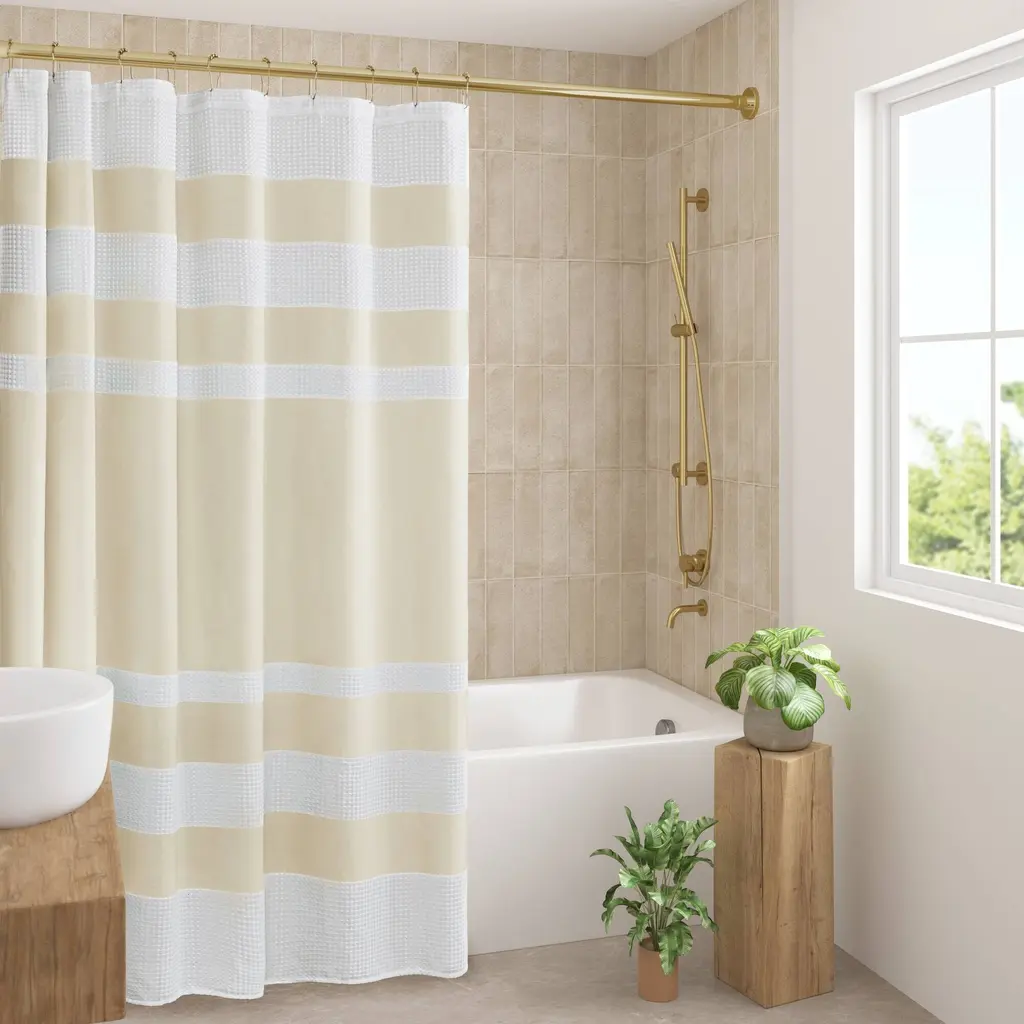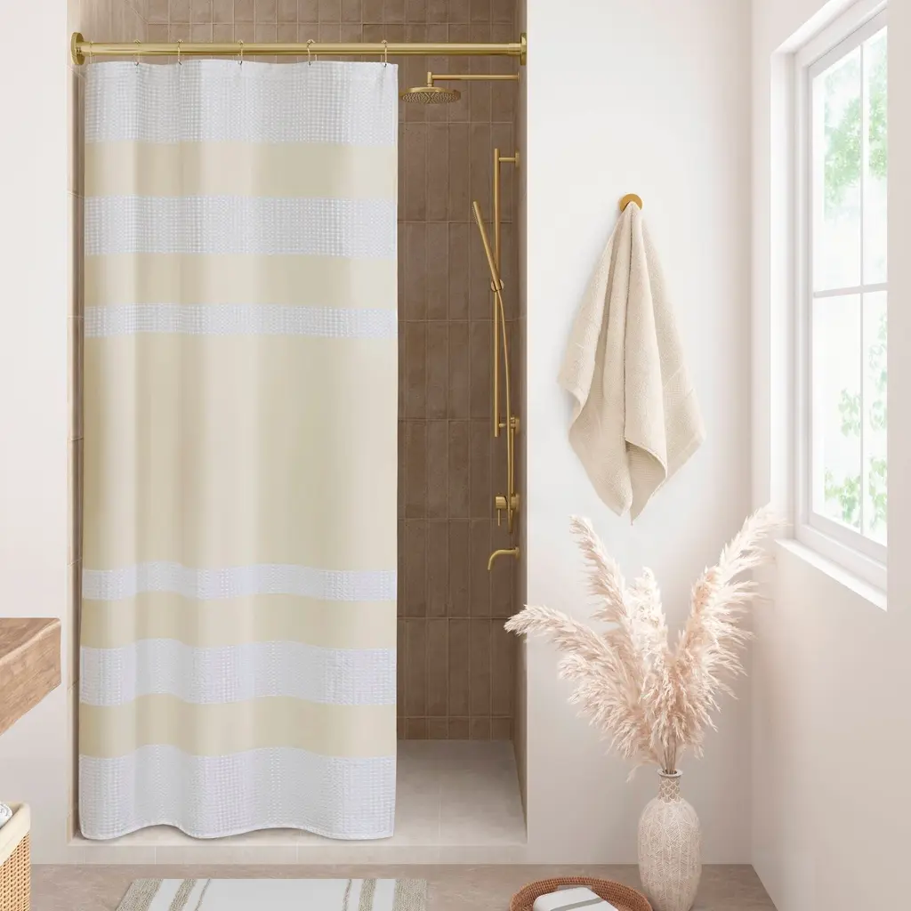 Experience a spa-like ambiance in your bathroom with the Madison Park Spa Waffle Shower Curtain. Made of durable polyester with a waffle weave base fabric, this modern contemporary stripe shower curtain features a chic color block and stripe design in multiple color options to match any bathroom decor. The 3M Scotchgard water repellent treatment ensures easy maintenance, while various sizes provide a perfect fit for any bathroom space. Please note that hooks, rod, and water repellent liner need to be purchased separately.Features:Dimensions: