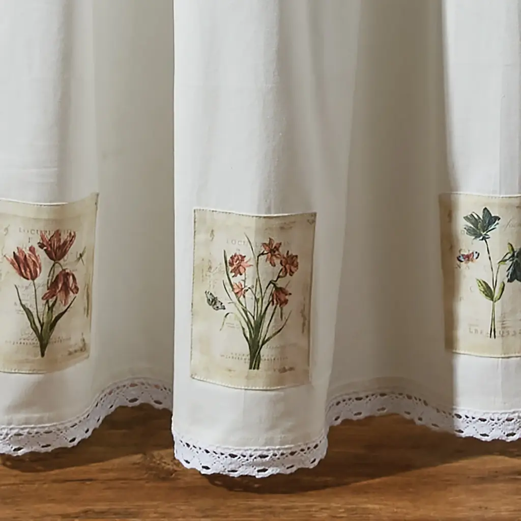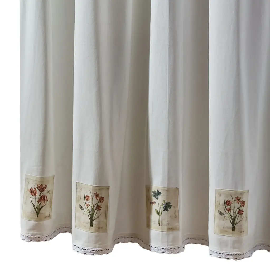 You will quickly fall in love with the exquisite appeal this beautiful shower curtain adds to your home decor. This durable fabric is designed to be used for years to come. Across the bottom are five charming, printed patches featuring a combination of botanical illustrations and butterflies, with an elegant lace border applied underneath. Complements any bathroom decor, such as rustic, cottage, cabin, farmhouse, and more!