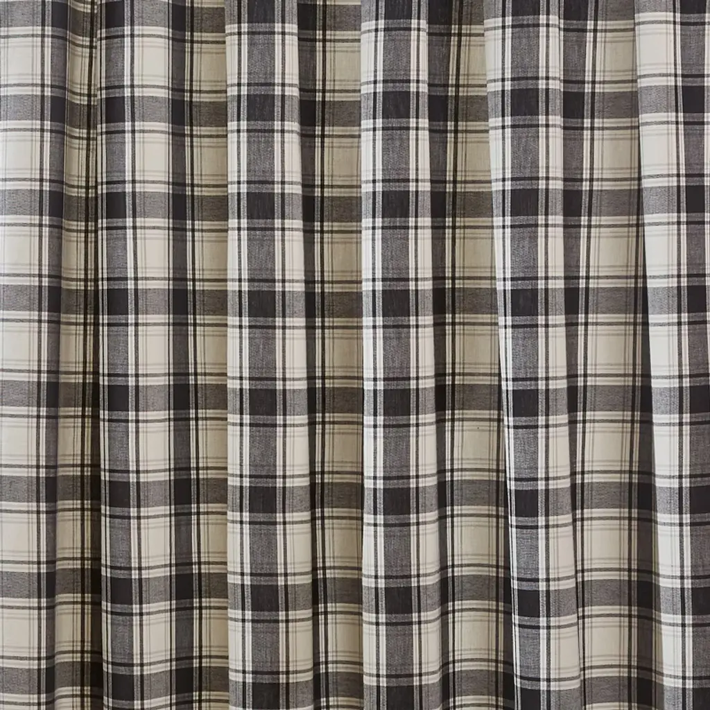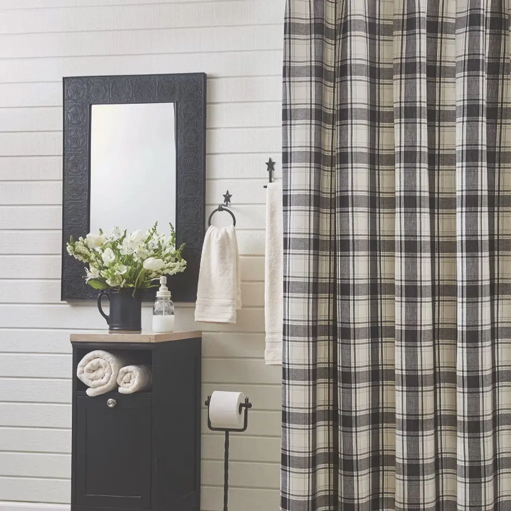 The Crossroads Shower Curtain brings classic design and timeless colors to your country bath! With a plaid pattern made of black, cream & gray this is a versatile option. Works well with your farmhouse or vintage style. The shower curtain features twelve sewn in holes for hanging and ample width and length, so when used on a standard bath, the curtain falls into attractive folds that adds warmth and comfort to the setting.