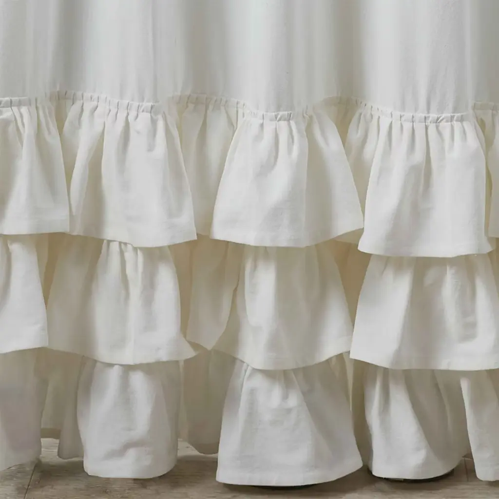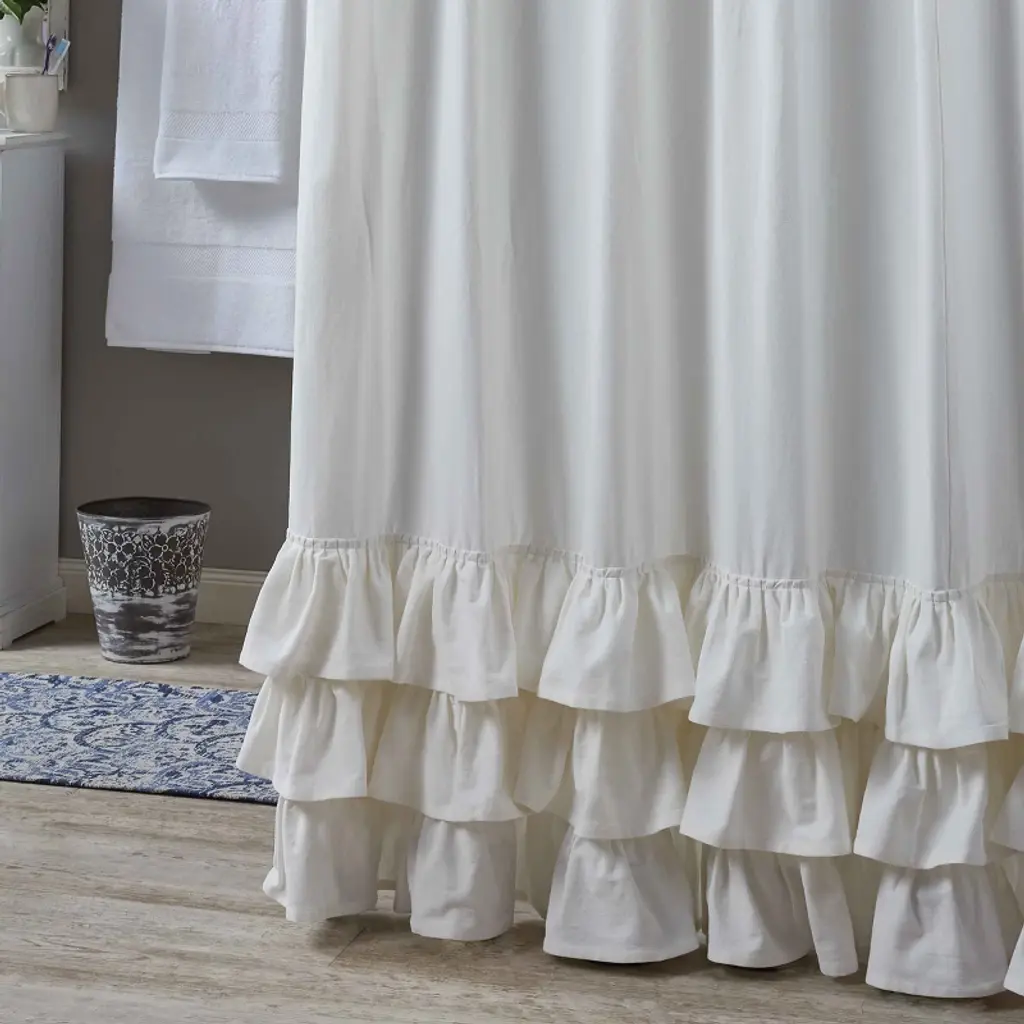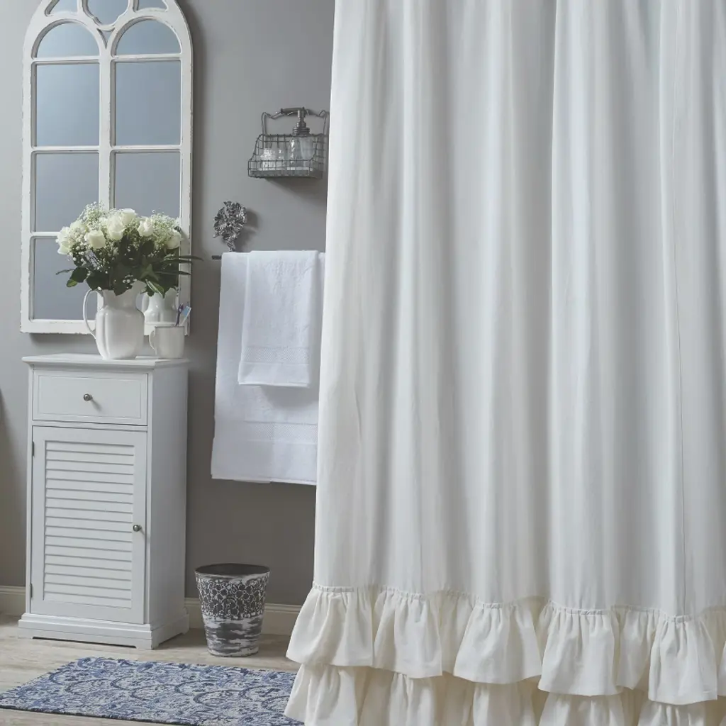 Create a beautiful country chic bathroom space with this subtle ruffled shower curtain. The plain color and simplistic design allows this bath accent to blend with a variety of interior styles, the decorative ruffle flair at the bottom adding a fun element to spice up the surrounding space. The shower curtain features twelve sewn in holes for hanging and ample width and length, so when used on a standard bath, the curtain falls into attractive folds that adds warmth and comfort to the setting.