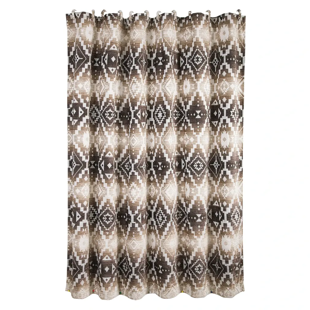 The Chalet Aztec Shower Curtain showcases striking geometric patterns in an earthy palette for a relaxed yet luxurious cabin feel. Warm colors of tobacco, taupe, mocha, and cream inspire a sense of warmth and ease in your bathroom, beautifully complemented by its Aztec-inspired pattern for a touch of Southwestern sophistication. Coordinate with our Chalet Aztec Bath Towel Set to achieve a contemporary lodge look. What's Included 1 Shower Curtain (with a dozen shower curtain rings) Dimensions 72"W x 72"L Material 100% polyester Care Dry clean recommended.Why Paseo Road by HiEnd Accents?About Paseo Road by HiEnd Accents At Paseo Road, we’re driven by our desire to create bedding and home décor that celebrates the history, heritage, and endless beauty of the rustic world. Our Dallas-based design team creates authentic rustic designs that you won’t find anywhere else. From traditional styles to modern rustic renditions, we're proud to be known as a leading designer of Western, Southwestern, Aztec, lodge, and cabin bedding sets and home décor for all seasons.