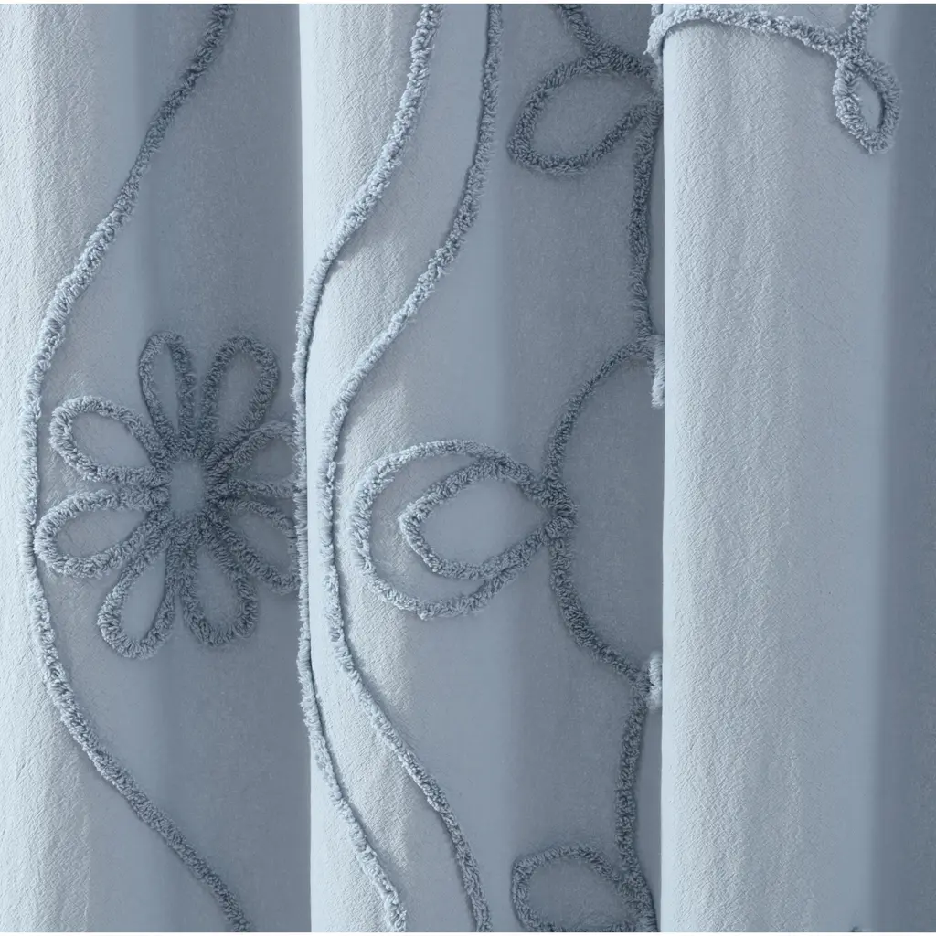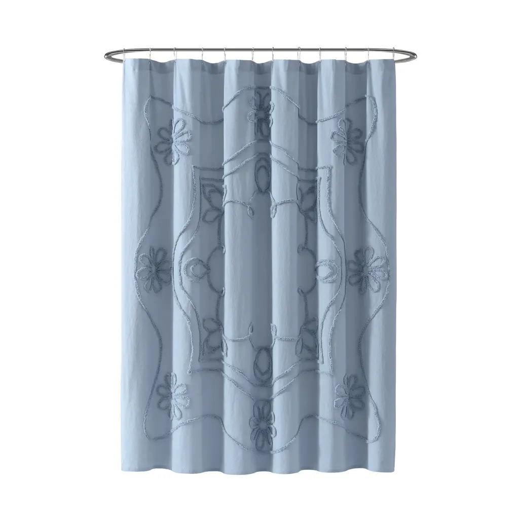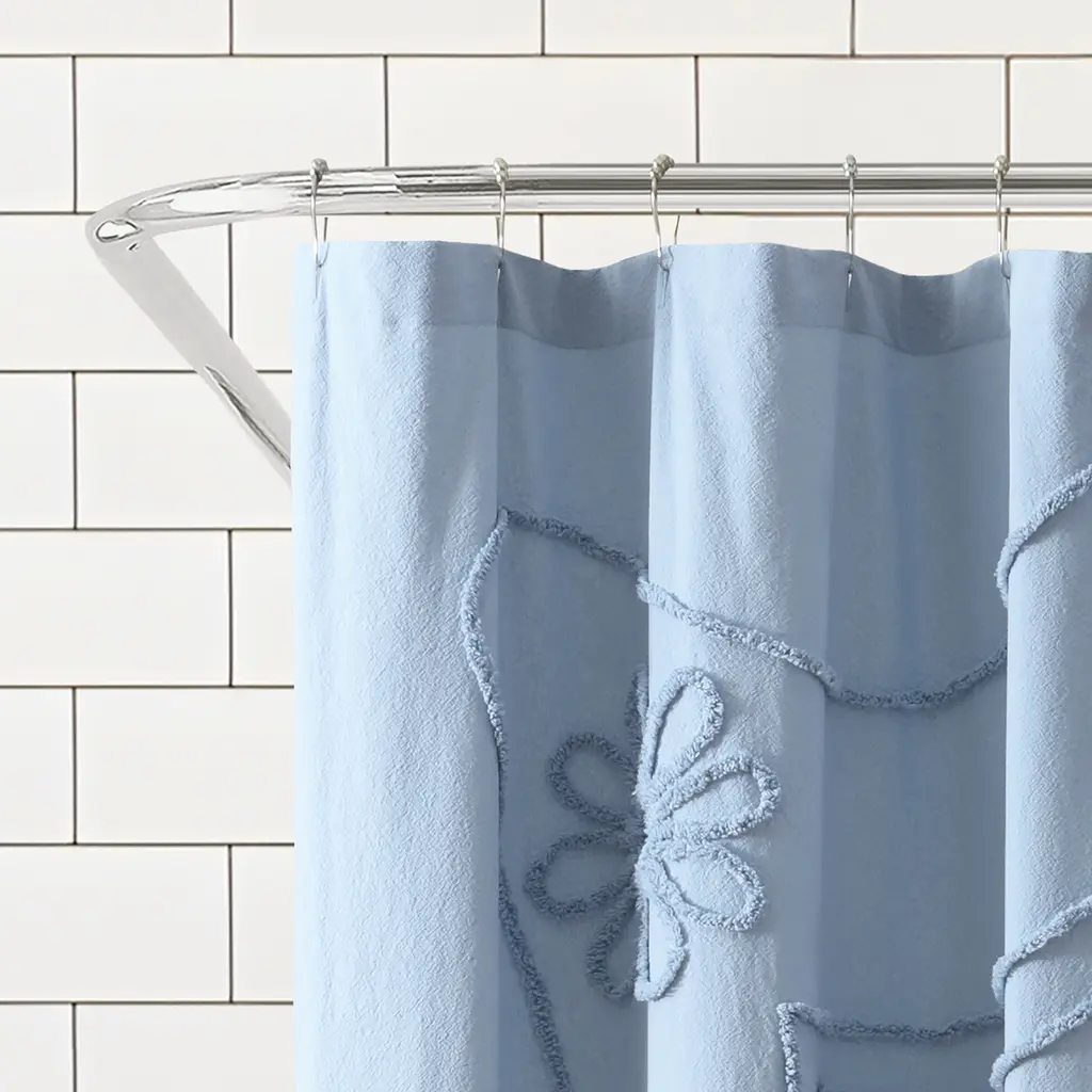 Update your bathroom with vintage charm with the Peri Home Retro Scroll Shower Curtain. The washed blue bathroom accessory is crafted from 100% cotton with a romantic chenille tufted floral pattern. Blooming with texture, this shower curtain will evoke a serene and comforting setting.