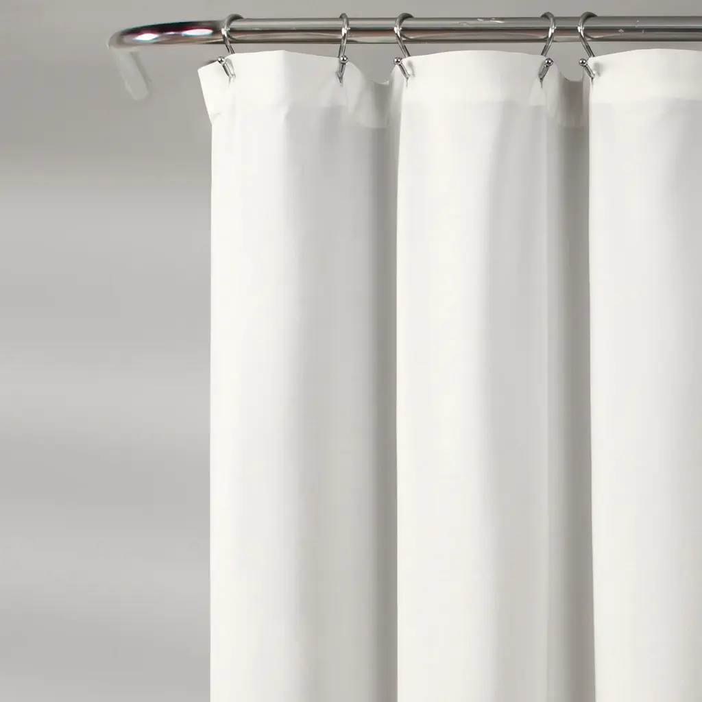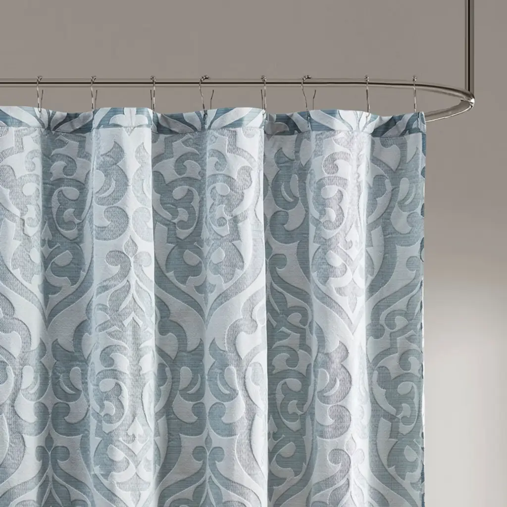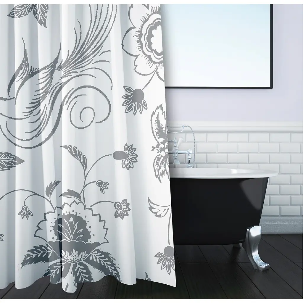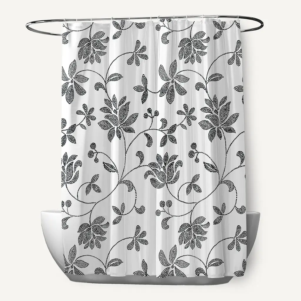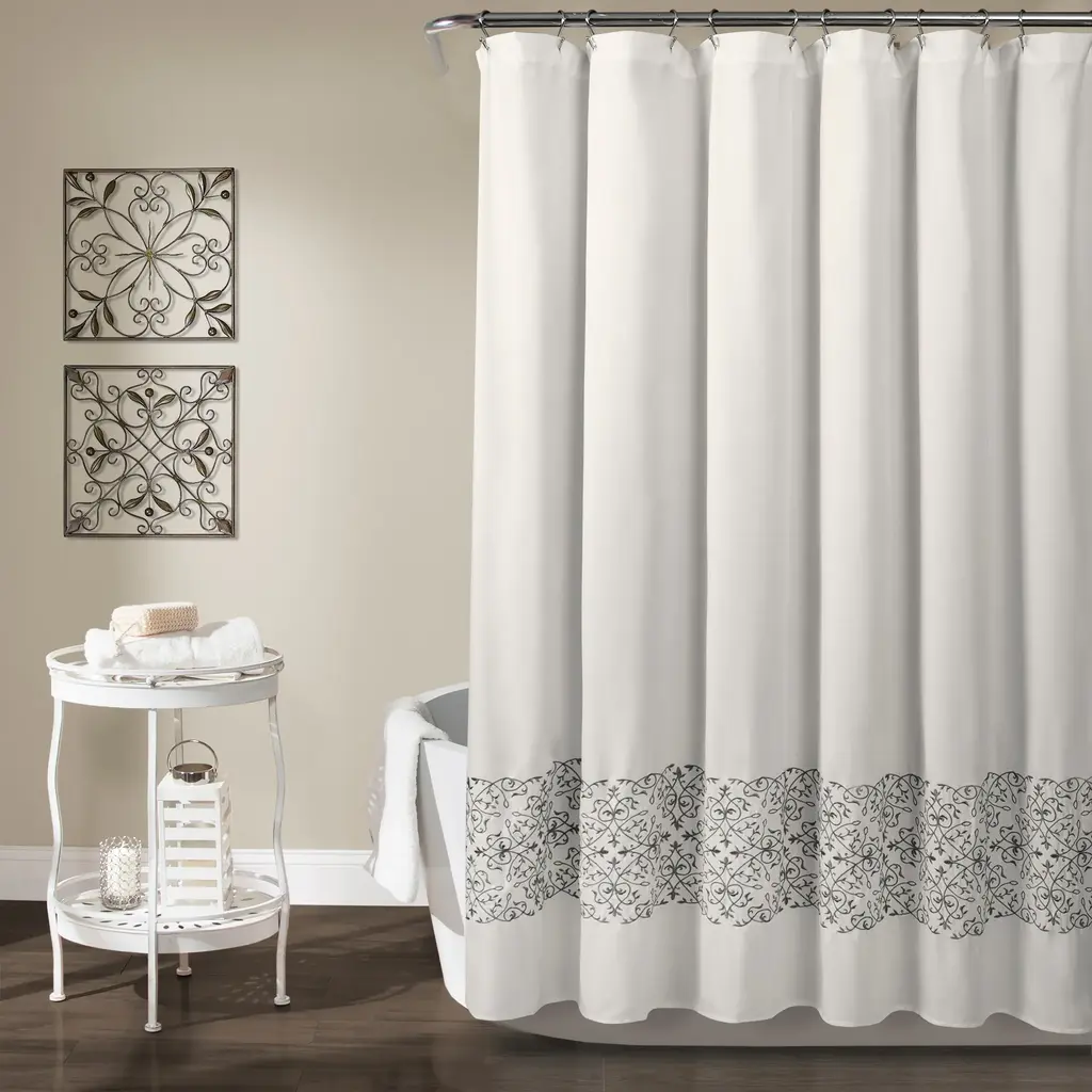 Energize the look of your bathroom with this Porch & Den shower curtain. The 100-percent polyester construction of the curtain makes it durable, and the embroidered Baroque-era vine pattern at the bottom offers a designer look. Made for use in all seasons, this curtain is machine-washable for easy cleaning.1 Shower Curtain: 72 inches long x 72 inches wide100% PolyesterMachine Wash Cold, Mesh Bag, Similar Colors, Gentle Cycle. Use Only Non-Chlorine Bleach When NeededTumble Dry Low, Light Iron If Needed.