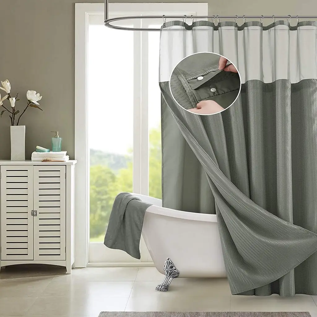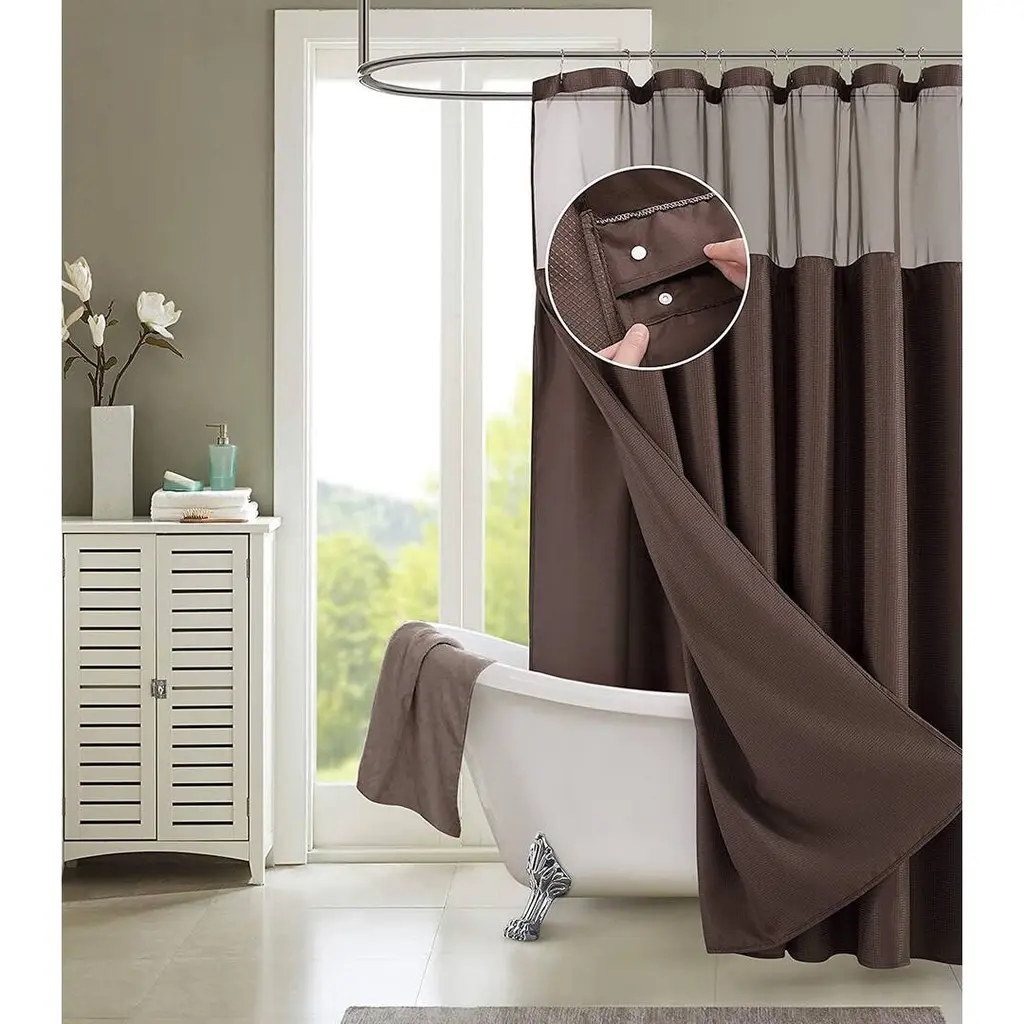 Transform any bathroom décor with this premium waffle weave fabric shower curtain with a snap-on liner by Porch & Den. The 2 in 1 shower curtain collection offers a beautiful woven waffle weave fabric curtain with an easy-to-use detachable fabric liner. These luxurious high-end hotel-inspired waffle-weave shower curtains provide the perfect combination of fashion, function, and design for the home. Constructed from heavy-weight fabric to ensure durability and long-lasting style, Hotel Collection shower curtains feature a visually pleasing, woven texture that makes you feel like you're on vacation at a tropical resort in your own home. The beautiful waffle weave fabric transforms an ordinary bathroom into a spa-like retreat. Soft to the touch, waffle weave shower curtains take your bathroom décor to a new design and comfort level. Porch & Den shower curtains offer style and decorating solutions for all bathrooms.Solid color waffle weave shower curtains are unisex and perfect for kids' or adult bathrooms. It also comes in a blue floral and decorative swirl design. Hang the Complete Waffle Weave Shower Curtain with built-in liner in every bathroom in your home – perfect for any bathtub, stand-up shower stall, or accessible standing claw foot bathtub with a standard-size curtain rod. Add 2 in 1 shower curtains by Porch & Den to coordinate with your bathroom towels, bath rugs, and wall décor without worry. Polyester fabric shower curtains are naturally water-repellant and maintain their beauty with limited washing. This solid color waffle weave shower curtain collection brings an eye-catching, signature look to any house, apartment, dorm, and more bathroom. You will impress your friends, family, and guests by hanging these lovely shower curtains for a stylish update to your bathroom. Hang this ultimate bathroom solution shower curtain when you update your shower heads and shower doors – to ensure a completely updated look. The waffle weave, honeycomb texture shower curtain with liner can be used indoors or outdoors. Reinforced holes and plastic snaps make it the perfect solution for your outdoor shower after using the pool or a day at the beach. This style-friendly shower curtain is available in various colors and complements any bathroom style and décor. The shower curtain measures 70 inches wide x 72 inches long and fits curtain hooks and liners not included. Easy care machine wash cold, gently dry cool – do not bleach.