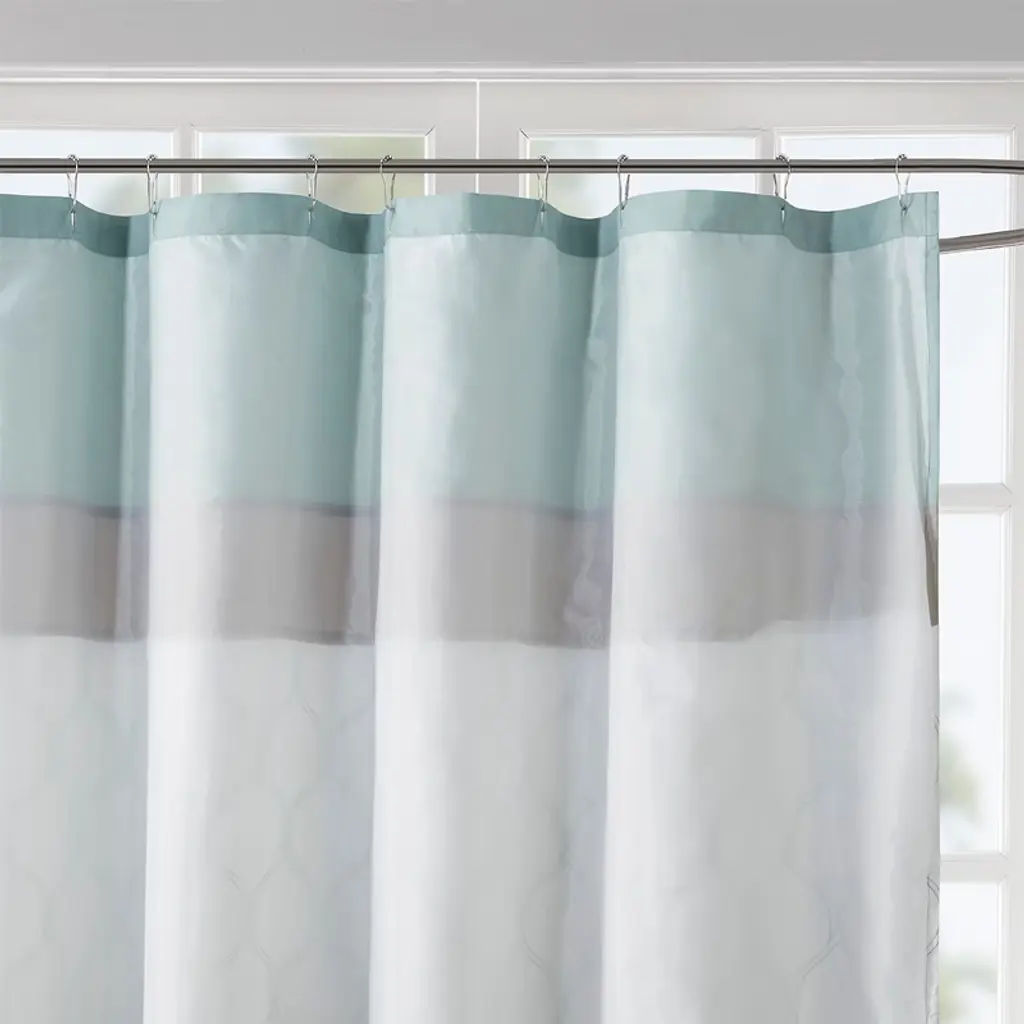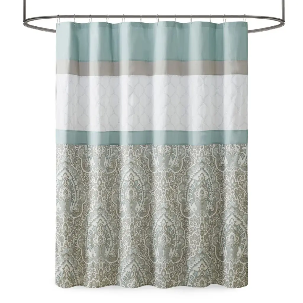 The 510 Design Shawnee Printed and Embroidered Shower Curtain adds a sophisticated flair to your bathroom decor. Featuring a printed and pieced design, this shower curtain flaunts an elegantly intricate pattern in beautiful seafoam hues for a traditional look. Embroidered detailing adds texture and charm to the design, while an additional lining provides better drapability and added privacy. Made from soft microfiber, this embroidered shower curtain is machine washable and brings a luxurious update to your bathroom.Product Details72x72"1 Shower Curtain:72"W x 72"LMaterialSoft microfiber, printed pattern pieced with embroidery, back with lining