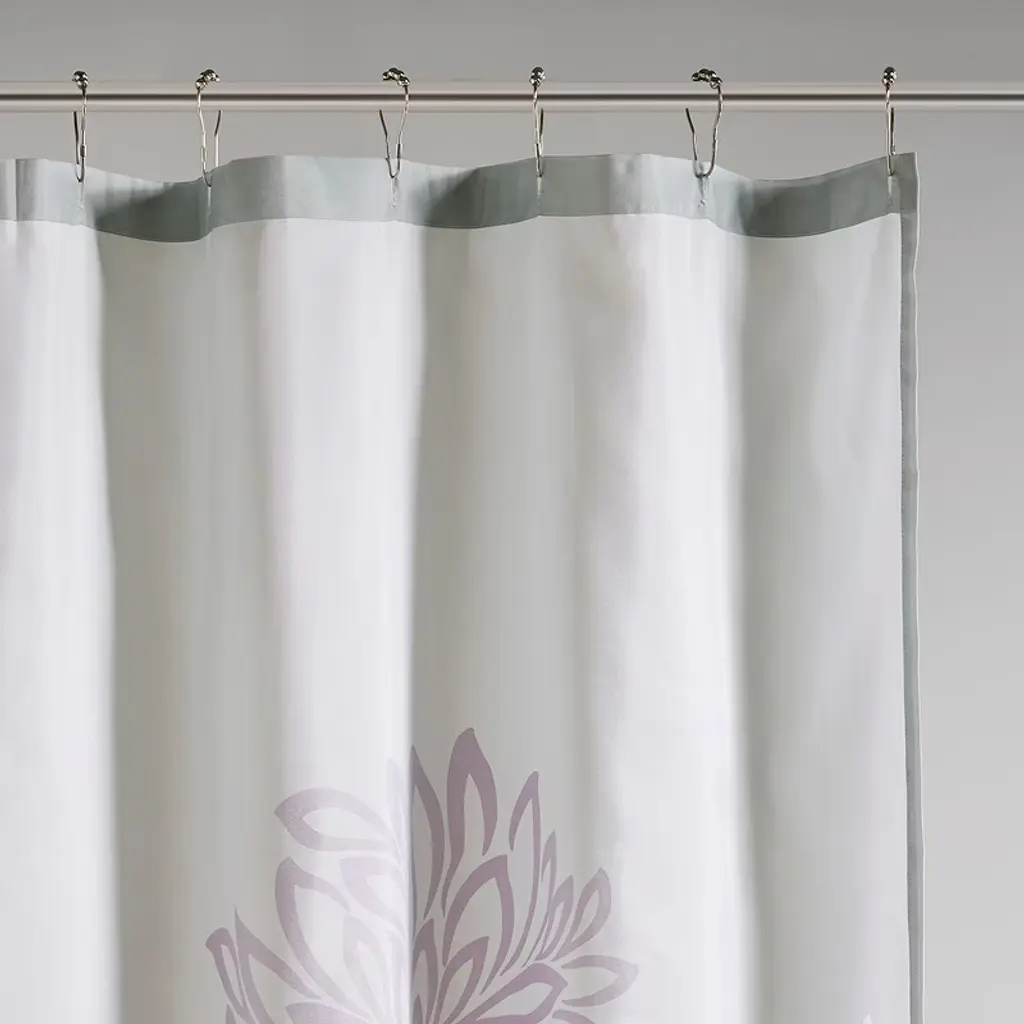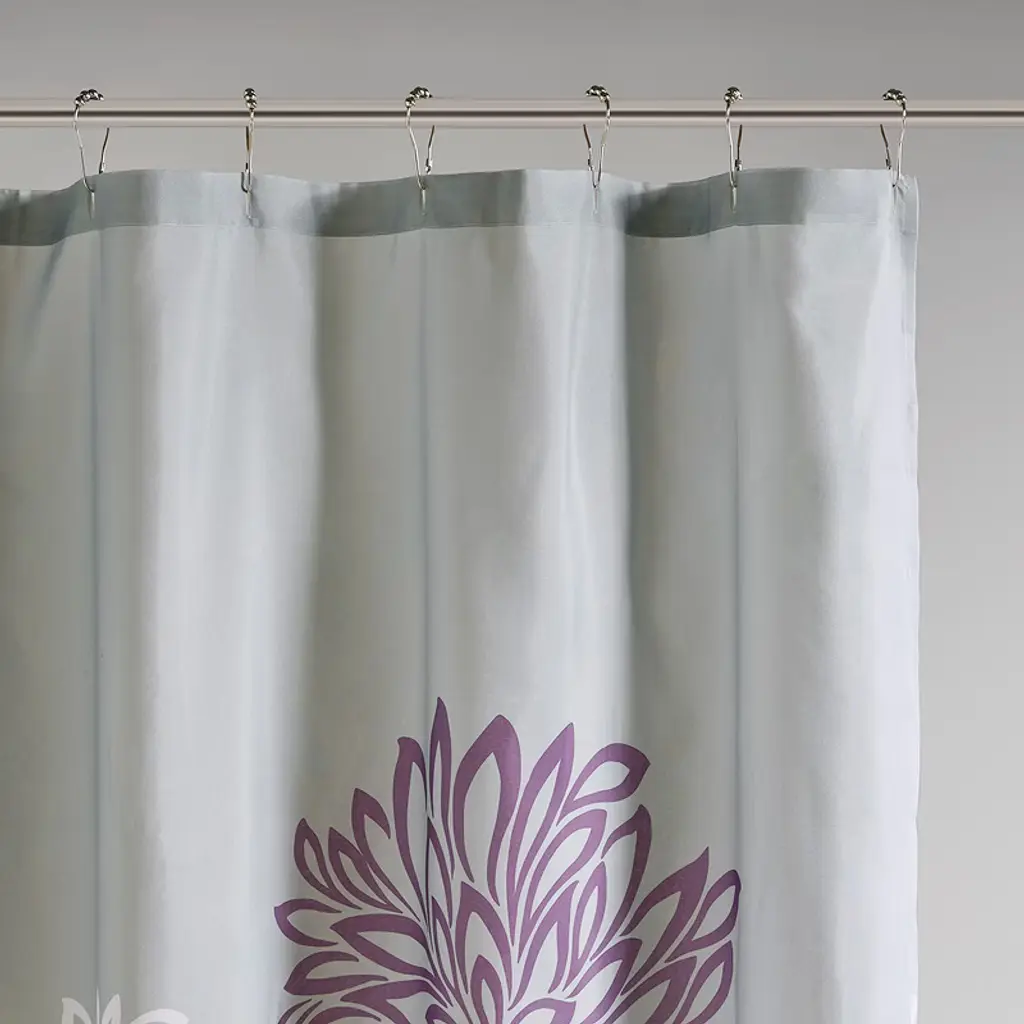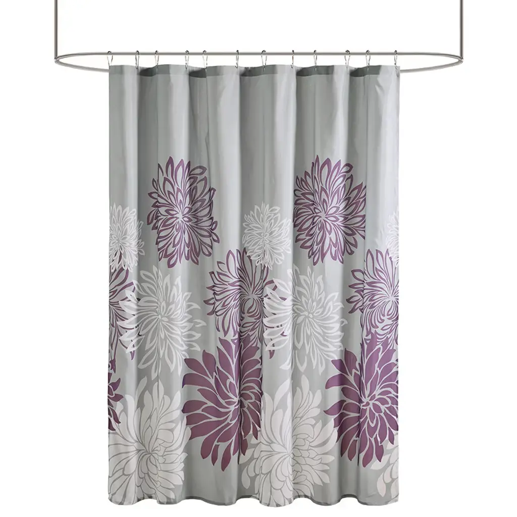 Transform your bathroom into a comfortably casual retreat with our Madison Park Essentials Maible Printed Floral Shower Curtain. This shower curtain features a beautiful printed floral design, in purple and white hues on a grey ultra-soft microfiber, for a fresh and lively touch to your decor. Measuring 72x72 inches and finished with 12 button holes at the top, this shower curtain is also machine washable for easy care. Complete the collection and look with coordinate bedding, available and sold separately.Product Details72x72"1 Shower Curtain:72"W x 72"LMaterial100% polyester print