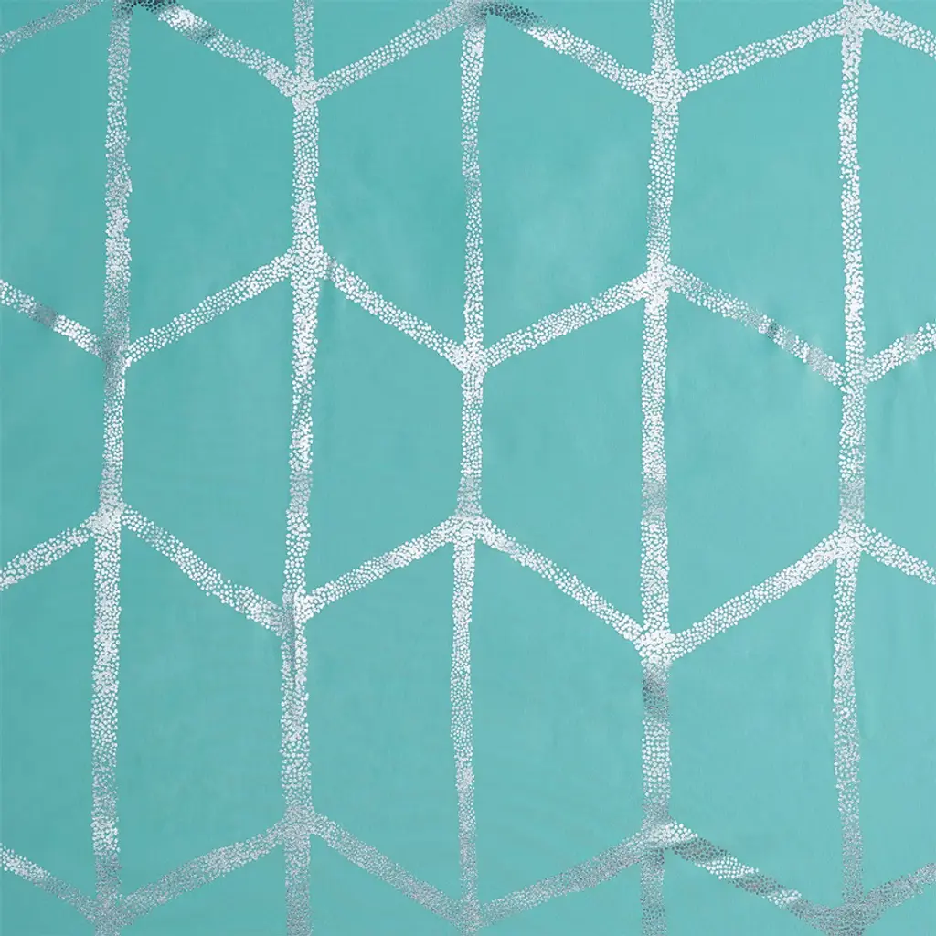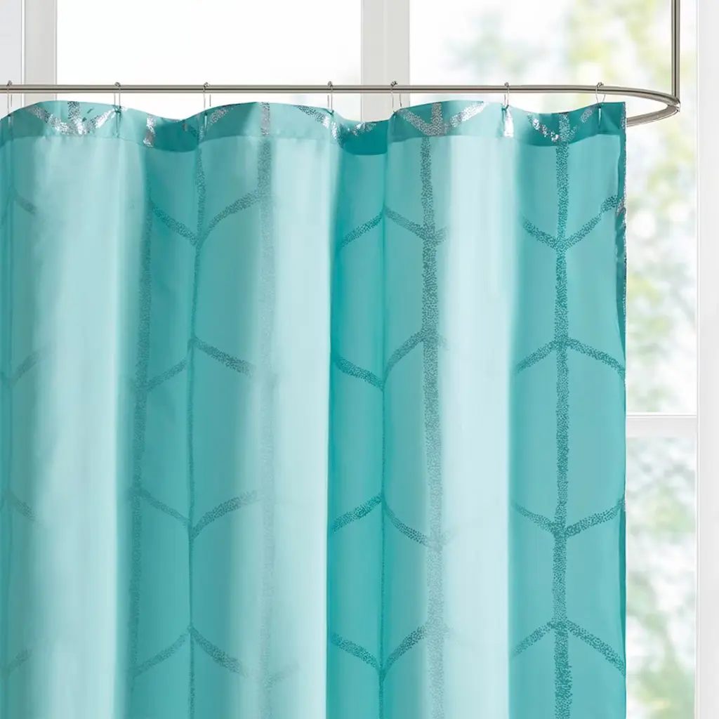 Freshen up your bathroom with the enchanting style of the Intelligent Design Raina Printed Metallic Shower Curtain. Flaunting a geometric metallic print, this stunning shower curtain creates a fun and eye-catching look! Machine washable for easy care, vivid hues brings a hip and modern flair to your bathroom.Product Details72x72"1 Shower Curtain:72"W x 72"LMaterialmicrofiber, printed