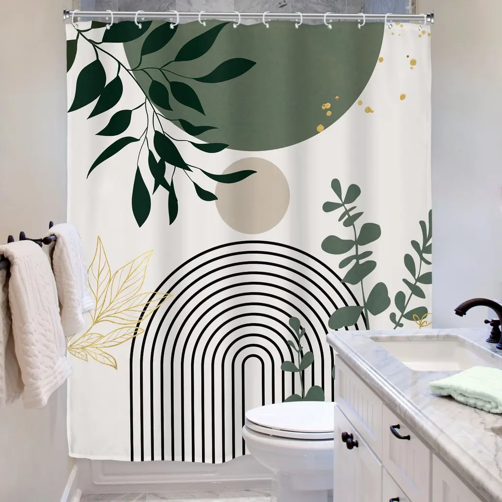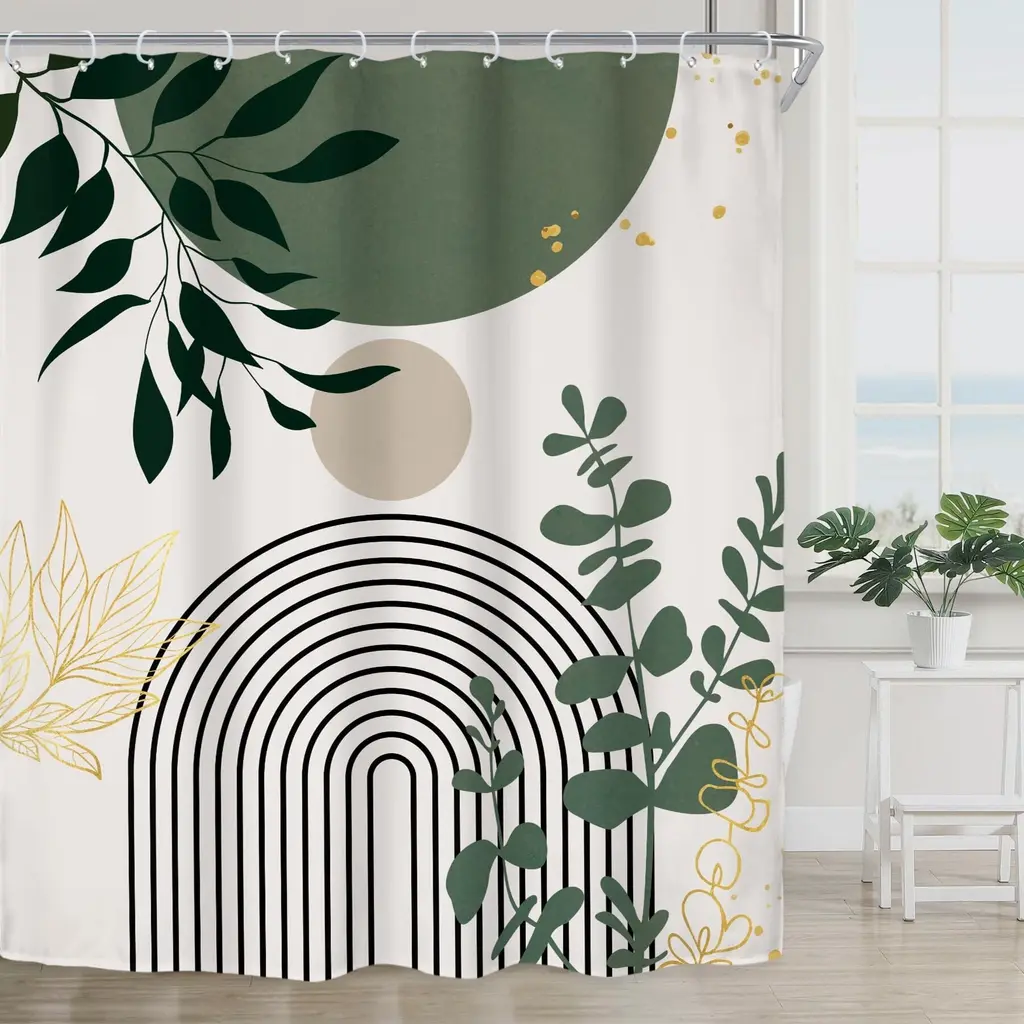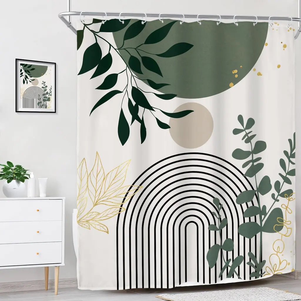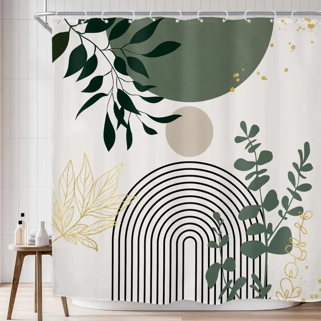 Sage Green Boho Shower Curtain, 60"x72", Gold Leaves, Waterproof