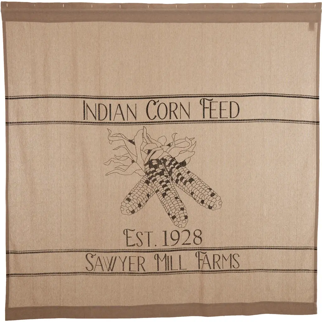 Fashion your bath with a touch of quality, farmhouse style. The Sawyer Mill Charcoal Corn Feed Shower Curtain adds unique rustic flair to your bath area featuring corn feed and Sawyer Mill Farms wording in a distressed appearance. The neutral, tan chambray background gives you the creative freedom to decorate your country style bathroom the way you want. Button holes at the top of this shower curtain make for easy hanging with the shower hooks of your choosing (not included).Features PREMIUM CONSTRUCTION: with over two decades experience crafting goods for American homes, our items are built to last for years to come.FARMHOUSE DECOR: fits your farmhouse home with updated country style.QUALITY MATERIAL: made with durable 100% cotton for a proper look and feel.Specifications Material: 100% CottonDimensions: 72" x 72"Weight: 1.7 lbColors: Khaki, CaviarHanging Method: 3" Rod PocketManufacturer Country: IndiaCare: Machine Wash, Tumble Dry Low, Iron safe