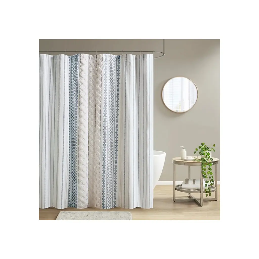 SEVOBAL Shower Curtain brings a vibrant, global-inspired Aztec print to your bathroom, adding a modern and cultural touch. Made from 100% cotton with tufted chenille stripe trim, it offers a soft, luxurious feel. The 12 button holes ensure easy installation and a secure fit. With a water-repellent feature, this curtain keeps water beads off the fabric, maintaining a dry, clean look. Machine washable for simple maintenance, this curtain stays fresh with minimal effort.