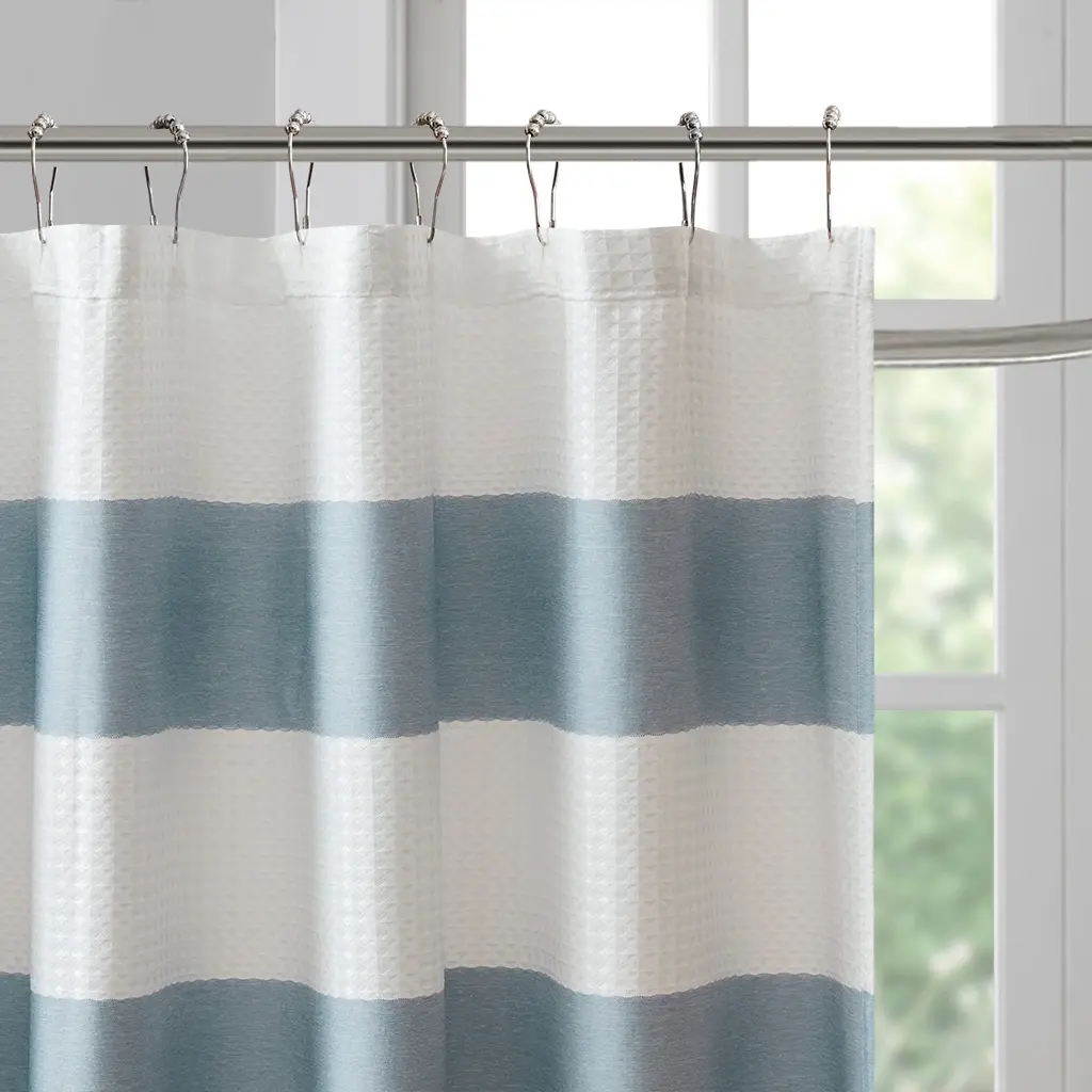 DescriptionUpdate your space with the Madison Park Spa Waffle Shower Curtain with 3M Treatment. Featuring a fresh and updated stripe design, this shower curtain is made of a light heathered colored fabric pieced with a white waffle weave base creating a beautiful texture for the perfect spa touch to your decor. A temporary 3M Scotchgard water repellent treatment keeps your curtain looking newer, longer and is active for multiple washes. A waterproof liner is not included but still highly recommended to keep this shower curtain in its best condition; Hooks and Rod also not included and should be purchased separately. Various colors and sizes are available to fit any bathroom space. Stripe design may vary per all other sizes. Complete the collection with coordinate Spa Waffle Bath Towel and Spa Cotton Bath Rug, available and sold separately. Product Features