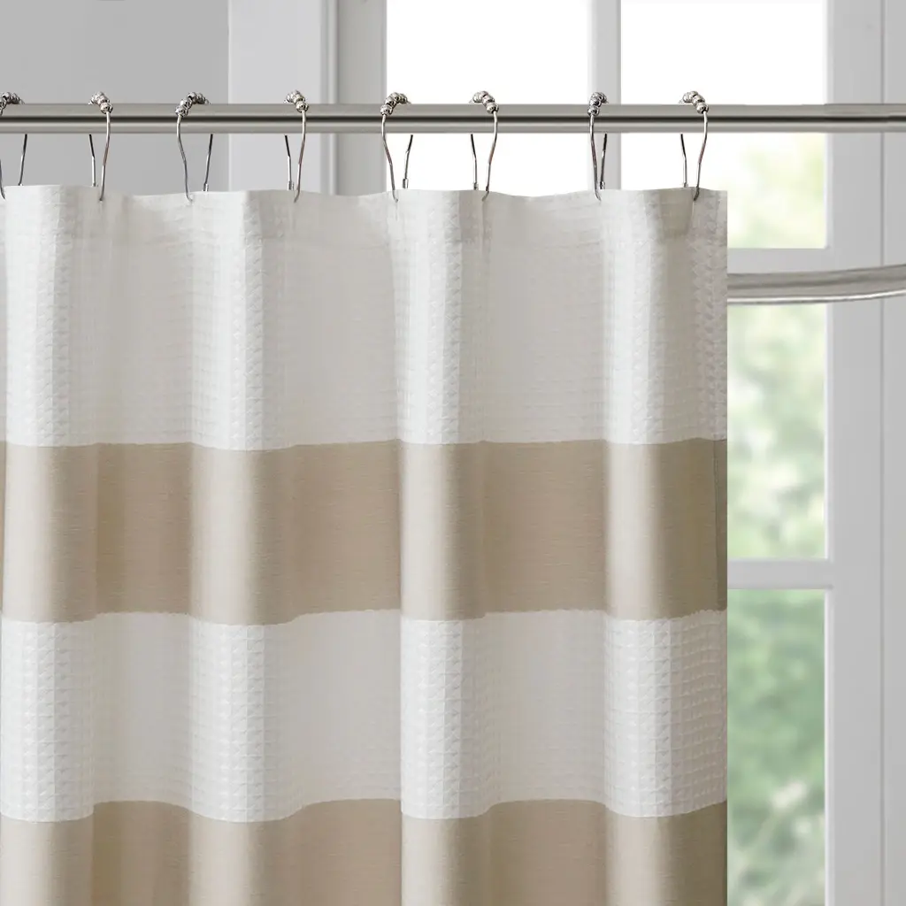 DescriptionUpdate your space with the Madison Park Spa Waffle Shower Curtain with 3M Treatment. Featuring a fresh and updated stripe design, this shower curtain is made of a light heathered colored fabric pieced with a white waffle weave base creating a beautiful texture for the perfect spa touch to your decor. A temporary 3M Scotchgard water repellent treatment keeps your curtain looking newer, longer and is active for multiple washes. A waterproof liner is not included but still highly recommended to keep this shower curtain in its best condition; Hooks and Rod also not included and should be purchased separately. Various colors and sizes are available to fit any bathroom space. Stripe design may vary per all other sizes. Complete the collection with coordinate Spa Waffle Bath Towel and Spa Cotton Bath Rug, available and sold separately. Product Features