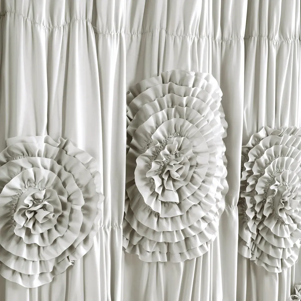 Transform your bathroom into a charming oasis with the Silver Orchid Bara Ruffle Flower Trim Shower Curtain. This lovely curtain features elegant ruffled flower applique accents that add a touch of whimsical elegance to any decor. Made with 100-percent polyester material, this curtain is available in white, light gray, blush or ivory, allowing you to choose the perfect shade to match your home. To ensure long-lasting beauty, dry clean only and use with a waterproof liner. Measuring 72 inches high x 72 inches wide, this curtain is the perfect size for any shower. Plus, it is OEKO-TEX Confidence in Textiles Certified, ensuring it is free from harmful substances.Features: