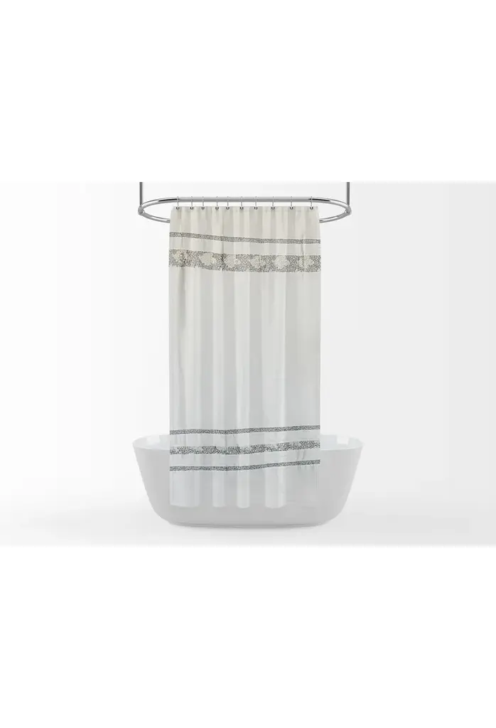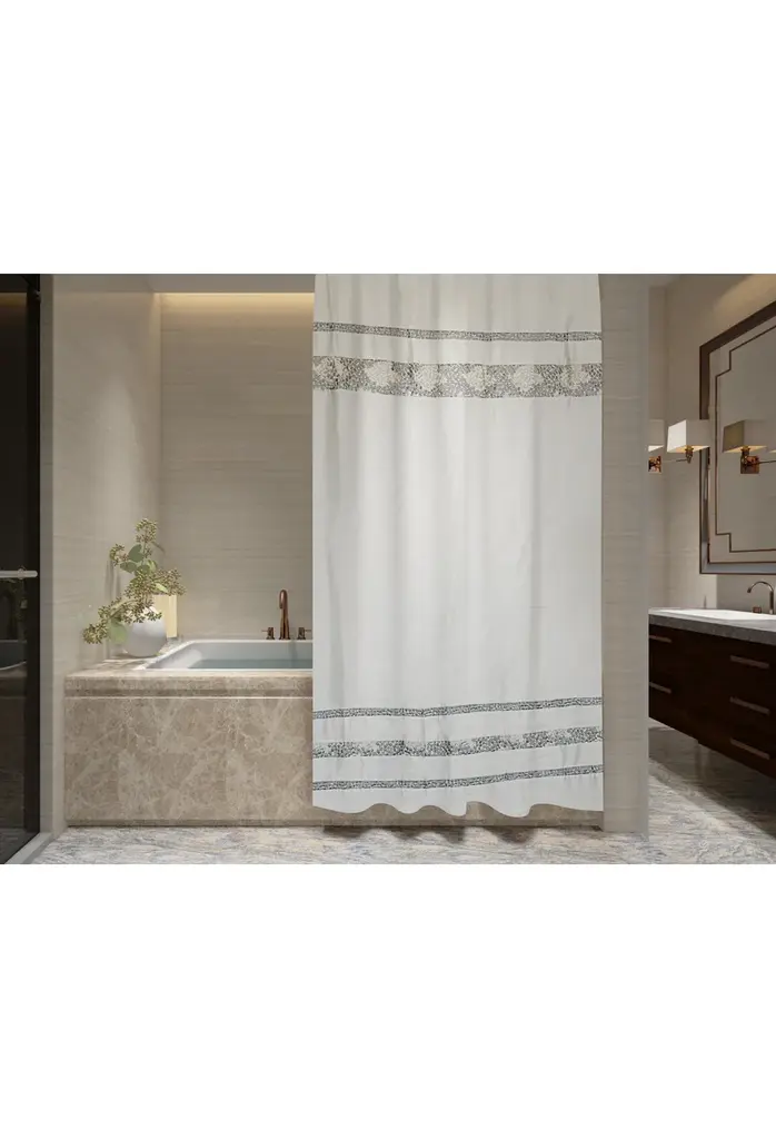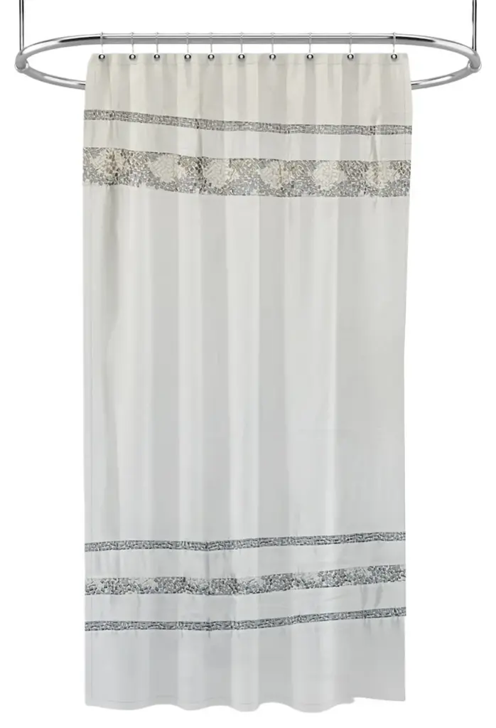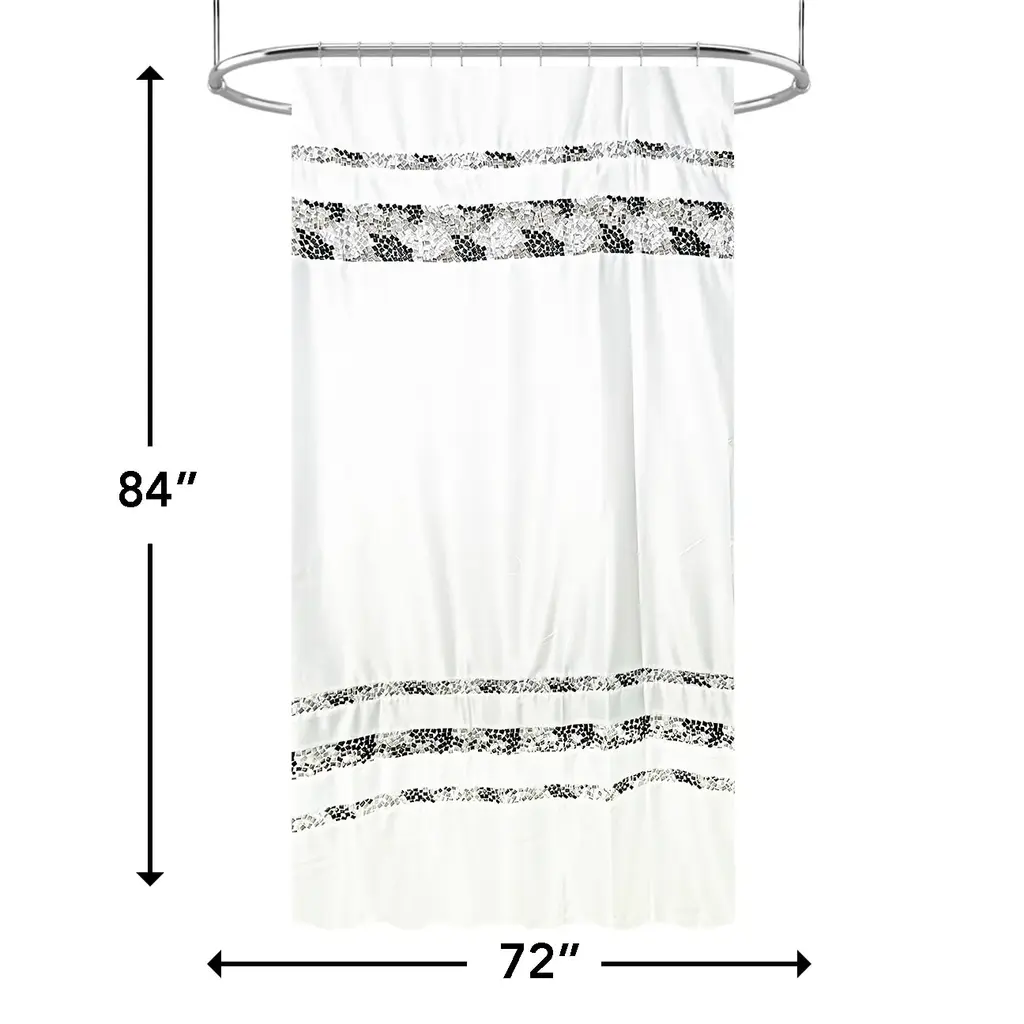 Details:Easily give a calm spa-like ambience to your bathroom with this crisp and clean satin-like shower curtain . The design is simple at a glance but sports a myriad of scattered embroidered tiles in multicolored dark aqua and gray shades within each horizontal band, reminiscent of a beautiful tiled pool in Santorini, Greece.1-pc set includes: Shower Curtain, 70" Width x 75" Height/72" Width x 72" Height/72" Width x 84" Height/72" Width x 96" Height/54" Width x 78" Height100% premium polyester that feels soft like satinHooks and shower liner sold separatelyUniversal hook holes, will work with all shower hooks and ringsMachine wash cold and tumble dry low