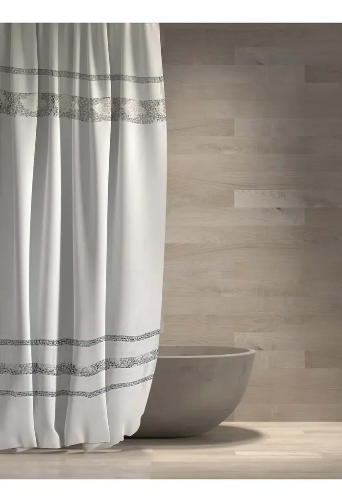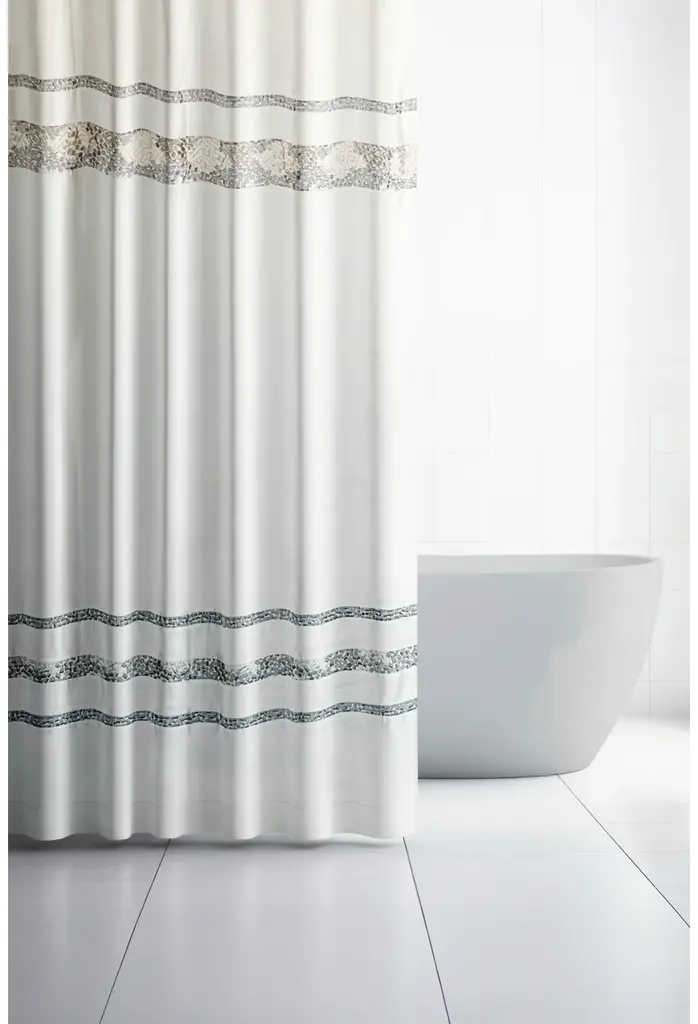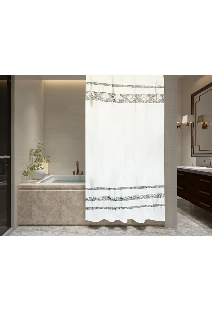 Spa Tile White Soft Fabric Shower Curtain With Multicolor Embroidered Tile Bands, White, 70x75