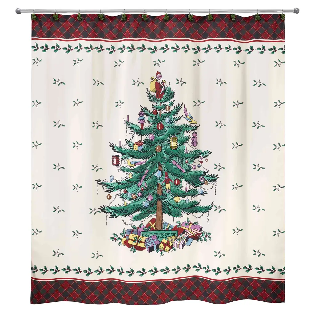 The Spode® Christmas Tree Tartan Shower Curtain features a large, iconic Christmas tree with rows of holly leaves and berries and tossed mistletoe. The top and bottom are bordered with red and green tartan plaid. Printed on 100% polyester, 72"L x 72" W. Rug, towels and accessories also available.