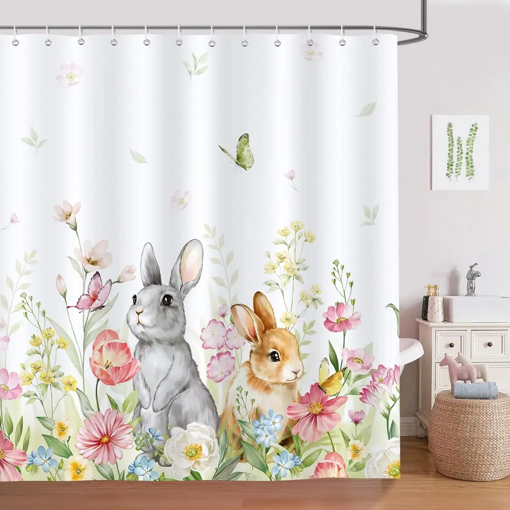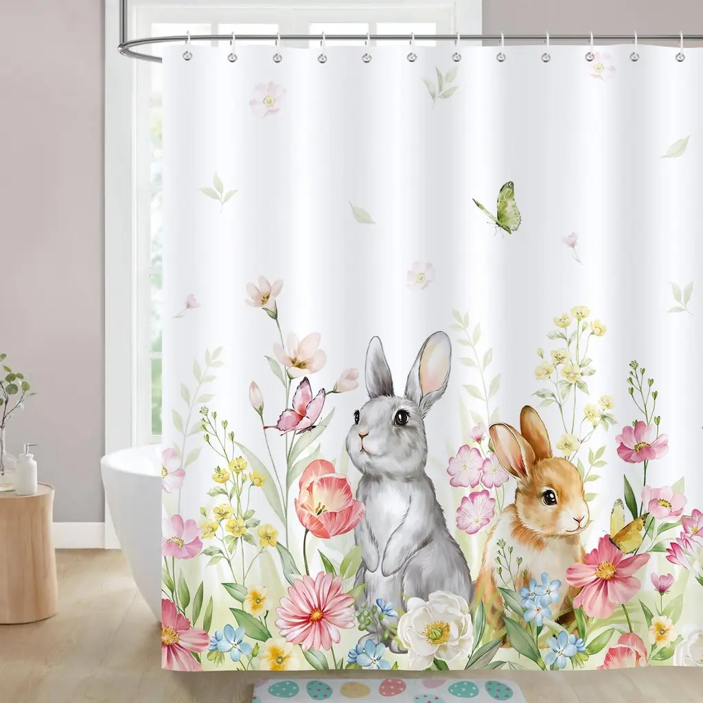 Introducing our charming Spring Easter Bunny Shower Curtain, featuring delightful rabbits amidst blooming floral plants, sized at 72 x 72 inches. Embrace the whimsical beauty of springtime with this enchanting design, perfect for adding a touch of seasonal cheer to your bathroom decor. Crafted with meticulous attention to detail, this curtain adds a playful and vibrant atmosphere to your space. Elevate your bathing experience with our Spring Easter Bunny Shower Curtain, where each shower becomes a delightful celebration of the season's renewal and joy.