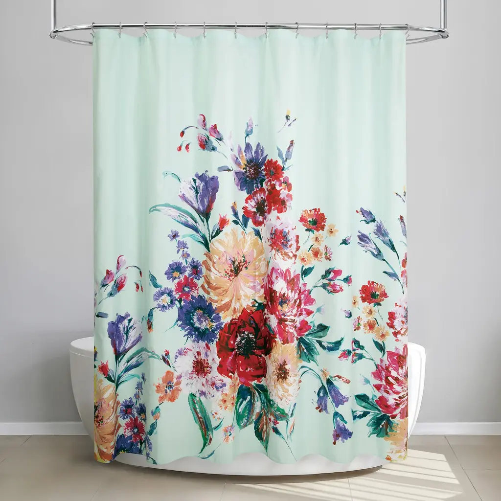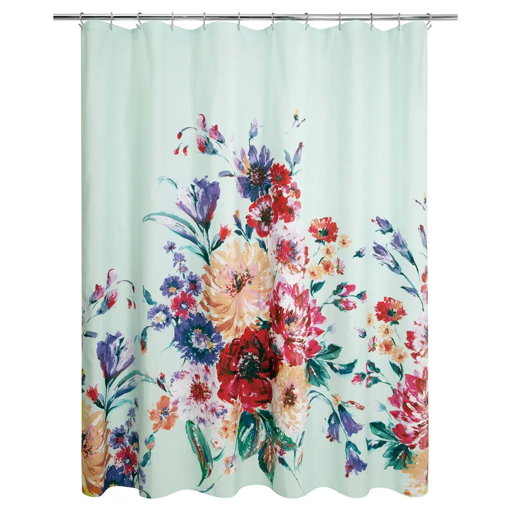 Add a rich pop of color to your bathroom with the Summer Garden Shower Curtain by Allure Home Creation. This beautiful floral design in vivid multi-colors on a soft green ground, features a lush floral bouquet of blooms capturing the beauty of an outdoor garden. This gorgeous design will add a lively freshness to your bathroom. This printed shower curtain measures 70" x 72" and fits most standard sized tubs and shower areas providing privacy and protection from water splashing onto the floor. Crafted from 100% easy care microfiber polyester fabric with a reinforced buttonhole top that works well with standard shower hooks and curtain rods. Use of a liner is recommended. Machine wash and tumble dry on low heat.