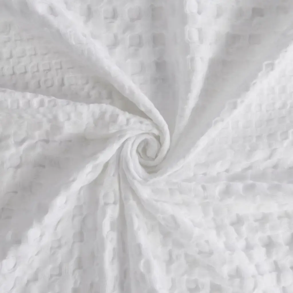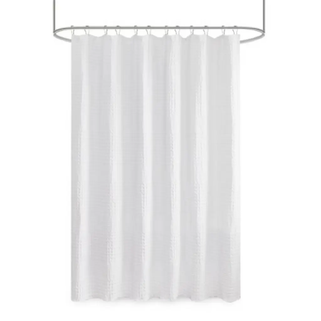 Description Give your bathroom a spa-like allure with the Madison Park Arlo Super Waffle Textured Solid Shower Curtain. This solid White shower curtain features a heavy waffle weave base fabric that creates a rich texture for a simple and stylish update. The medium weight fabric allows a natural and rich drapability, while the 100% cotton provides the perfect natural touch. Each shower curtain is machine washable for easy care and finished with 12 button holes at the top, making it easy to attach hooks and hang on rod (hooks and rod not included). A water repellant liner is not included, but highly recommended to ensure the best care and handling of this rich medium weight shower curtain. Coordinates perfectly with the Madison Park 800 GSM Bath Towel Collection. Product Details 72x72" 1 Shower Curtain:72"W x 72"L Material 100% Cotton