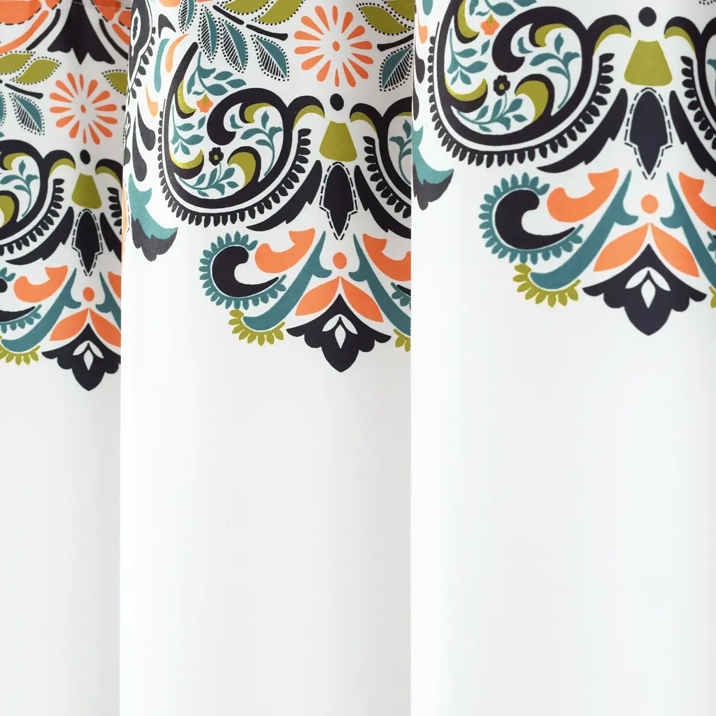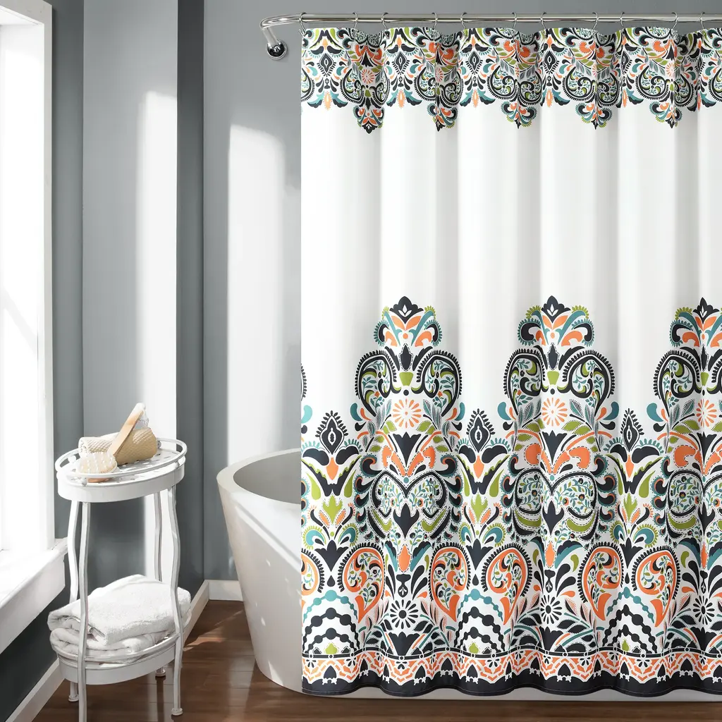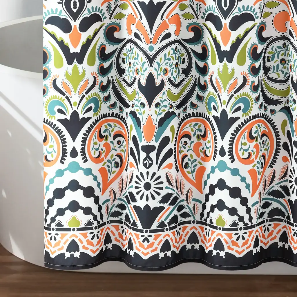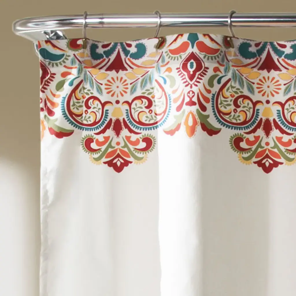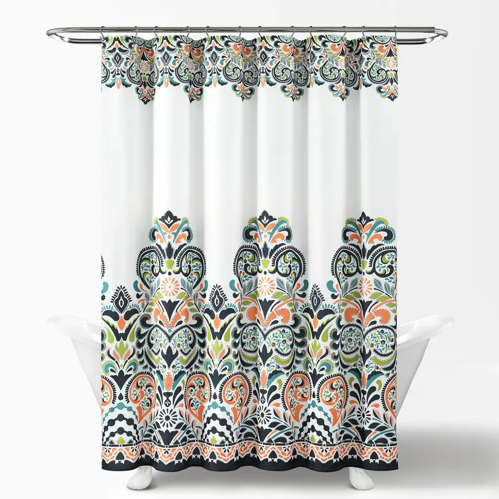 Elevate your bathroom decor with the Curated Nomad Lyon Damask Shower Curtain. Made of high-quality polyester, this curtain boasts a large damask pattern in vibrant coral, turquoise, orange, and gold colors, adding a touch of boho chic to your space. Machine washable for hassle-free maintenance, it measures 72 inches wide by 72 inches long.Features: