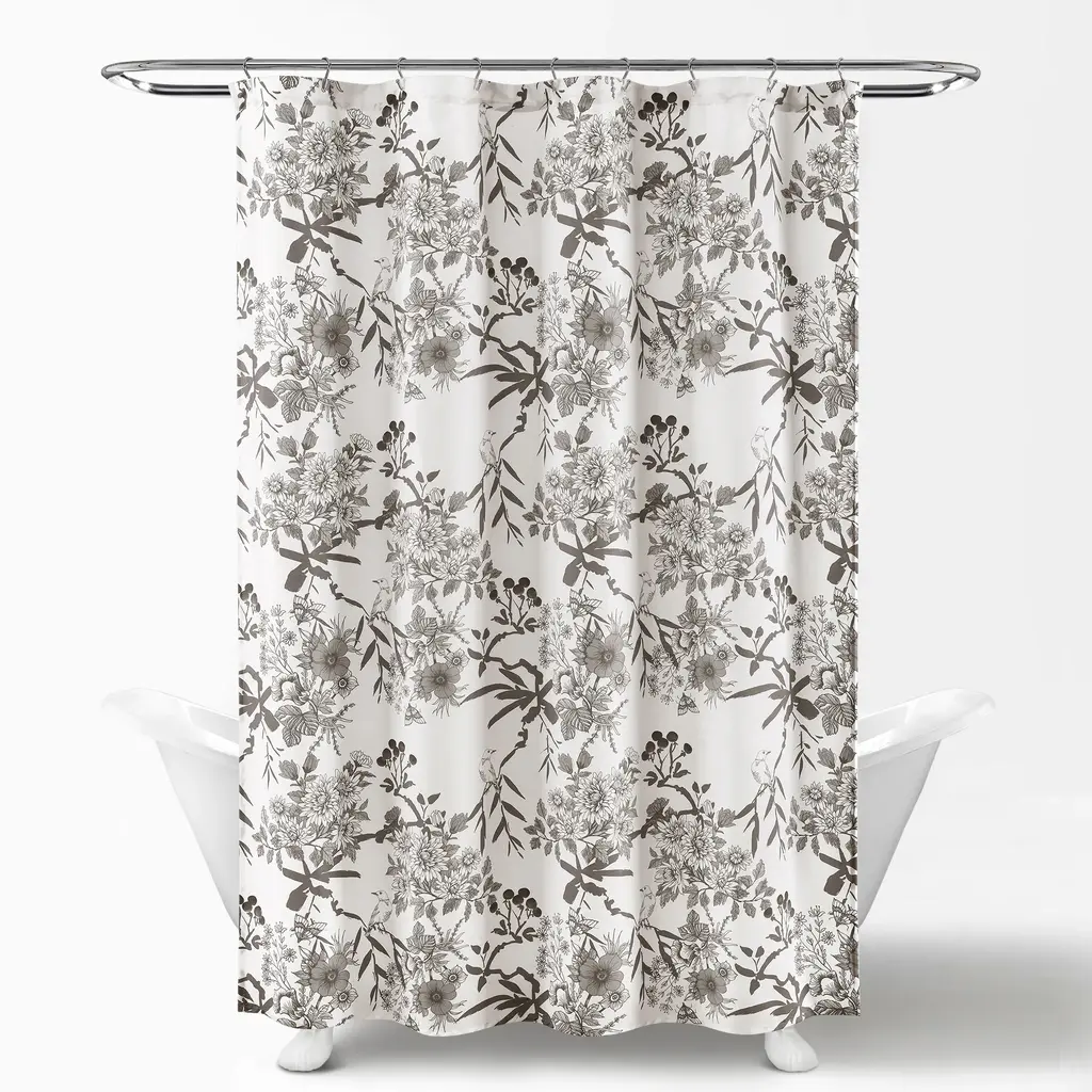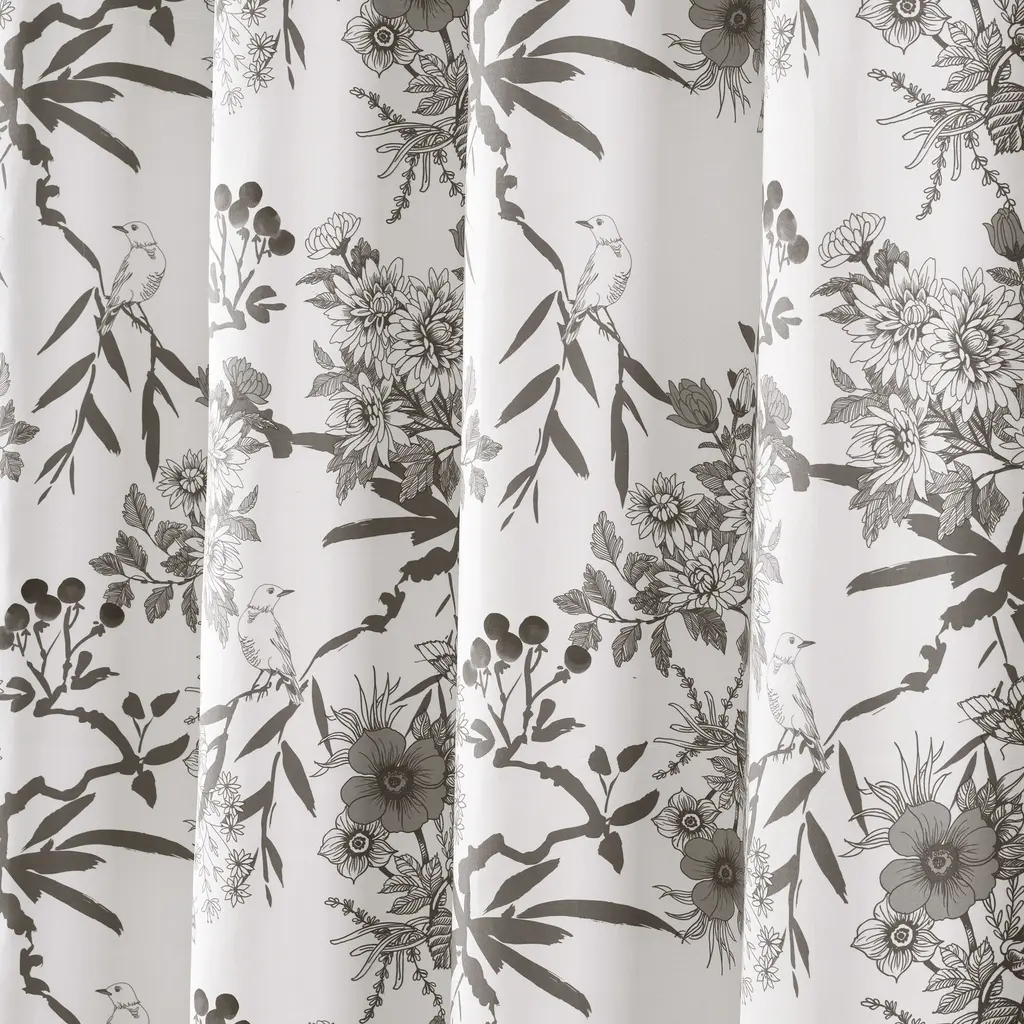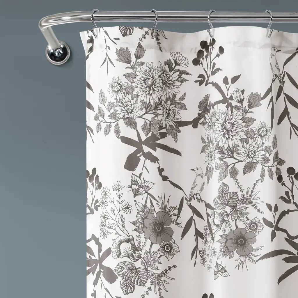 Perfectly suited to country cottage decor, this shower curtain lends a lovely and whimsical touch to any bathroom. The graceful floral pattern is embellished with little birds resting on branches for a lively look sure to elevate decor in an instant.Features: 100-percent polyesterFloral and bird patternGrey and white colorsMachine wash cold, gentle cycleTumble dry low, light iron if needed72 inches long x 72 inches wide